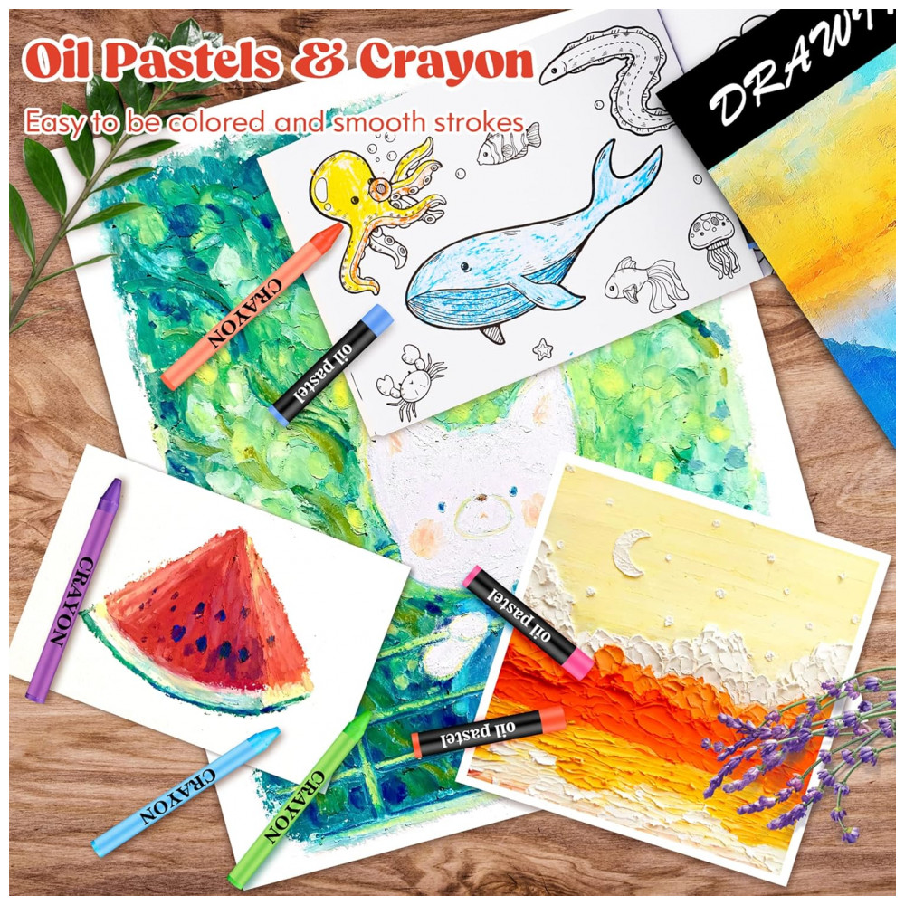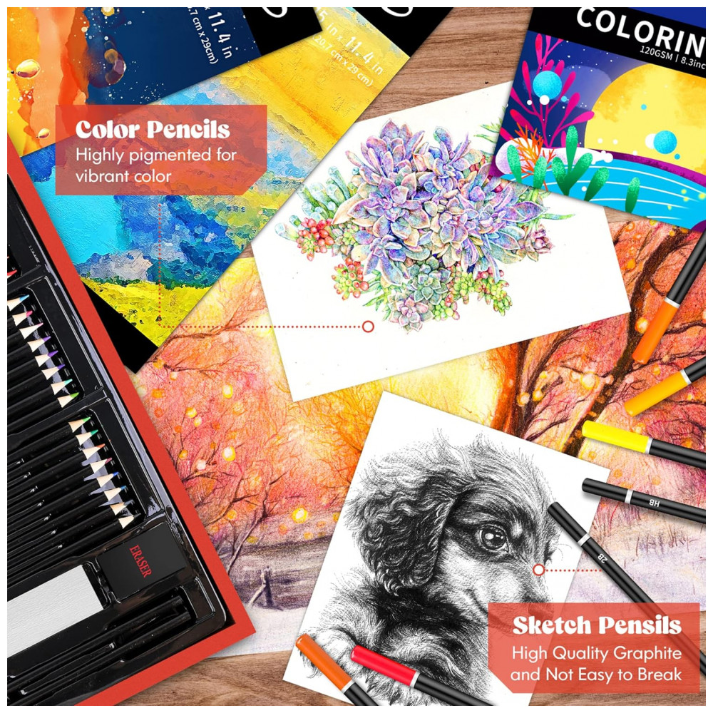 Tudo em um para todos O conjunto de arte contém muitos kits de desenho, dando aos pintores uma variedade de maneiras de pintar. Todos os itens são feitos de materiais não tóxicos. Este conjunto de desenho é muito adequado para crianças e adultos e é o melhor presente de arte para r a imaginação. Este kit de suprimentos de desenho oferece a artistas iniciantes, crianças e qualquer pessoa que procure suprimentos de arte de qualidade tudo o que eles precisam para ter sucesso em um estojo de arte completo. Kits de arte brilhantes e coloridos para inspirar o lado criativo das crianças.