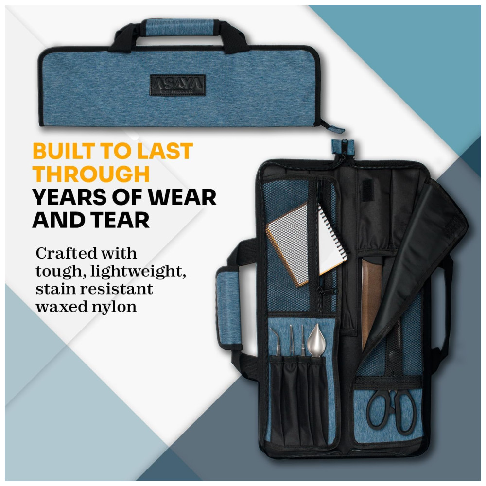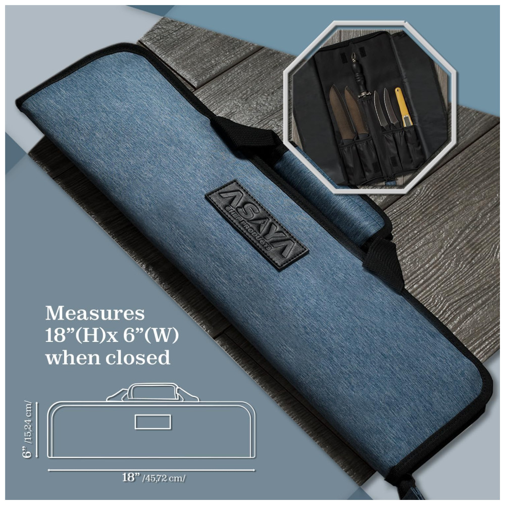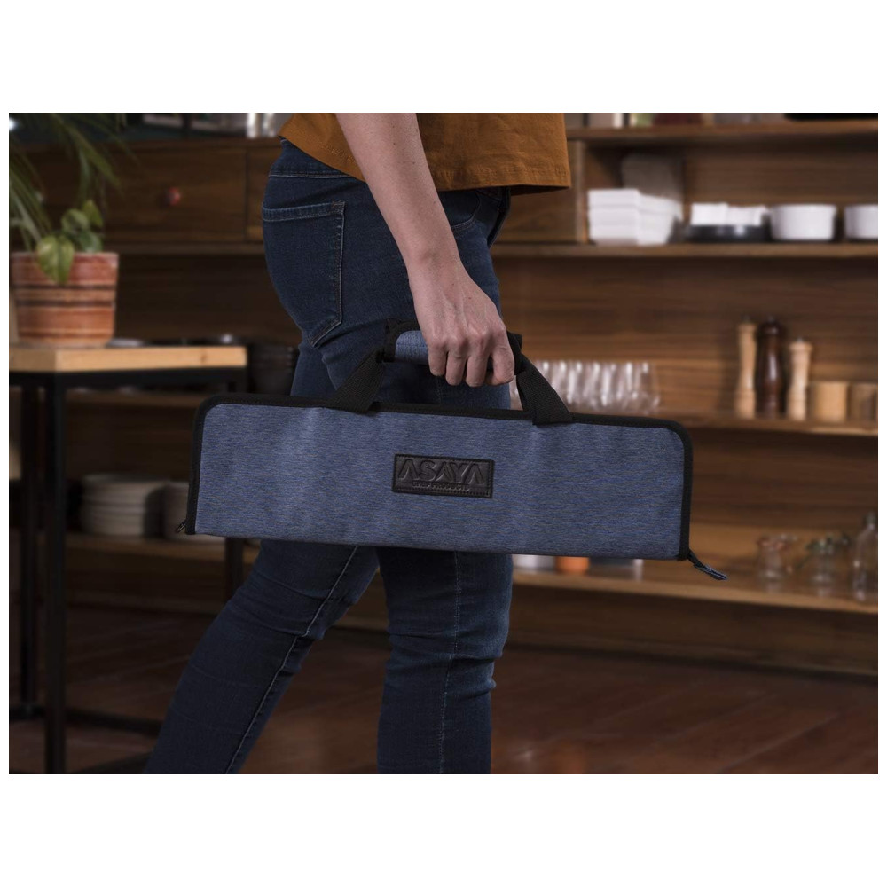 ARTESANATO ESPECIALIZADO Os rolos de facas Asaya são meticulosamente projetados para criar os estojos de viagem perfeitos para suas facas e equipamentos de chef. Feitos à mão com nylon resistente, leve e resistente a manchas, eles são construídos para durar muitos anos de uso e desgaste da cozinha. Queremos que nossos Chefs sejam configurados com o melhor equipamento possível que os dure por toda a vida.