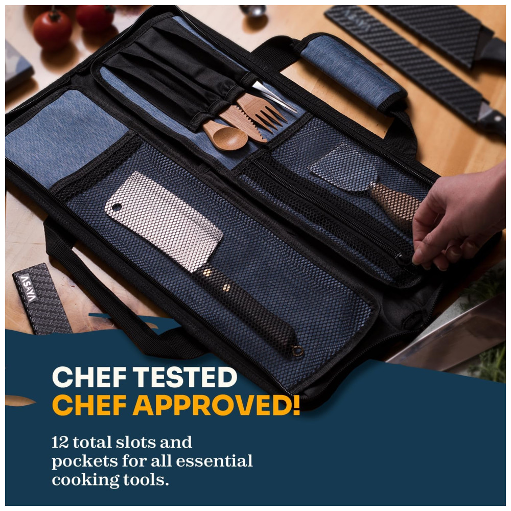 ESPAÇOSO E ESPAÇOSO Com 12 slots de faca no total e bolsos com zíper, este estojo de faca profissional pode transportar facilmente um conjunto completo de facas de chef e utensílios de cozinha.