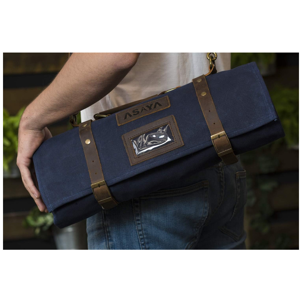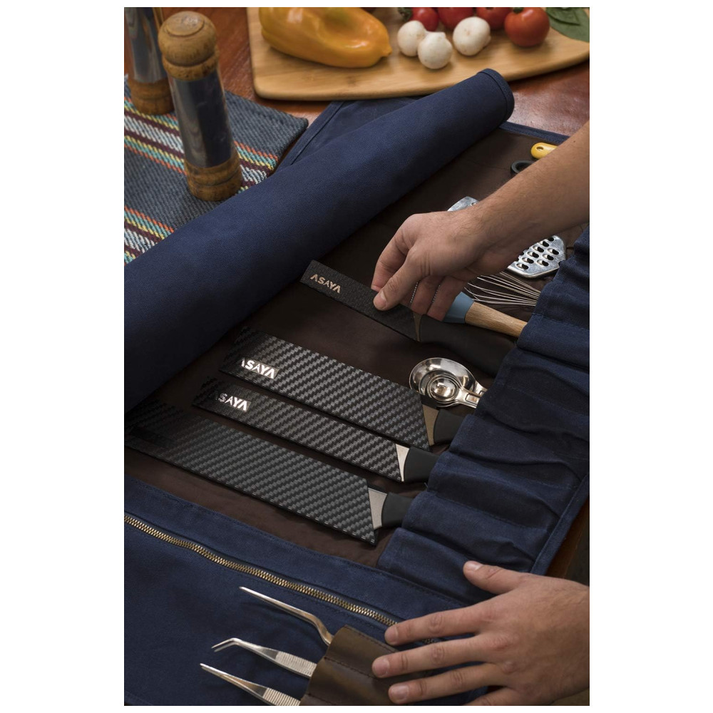 EXPERT CRAFTSMANSHIP Os rolos de faca de lona encerada Asaya são meticulosamente projetados para criar o estojo de transporte perfeito. Feitos à mão com lona encerada resistente e à prova dágua, couro de grão superior e fivelas de latão, eles são construídos para durar muitos anos de uso e desgaste da cozinha. Queremos que nossos Chefs sejam configurados com o melhor equipamento possível que os dure por toda a vida.