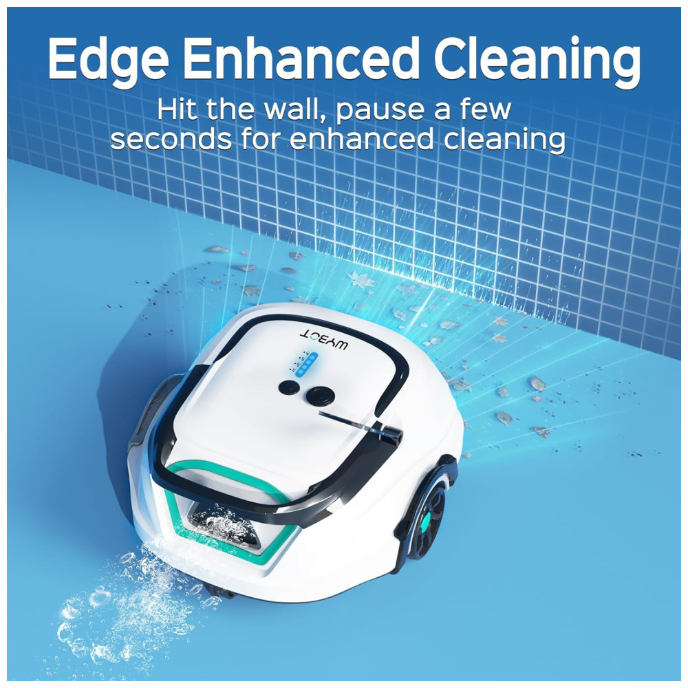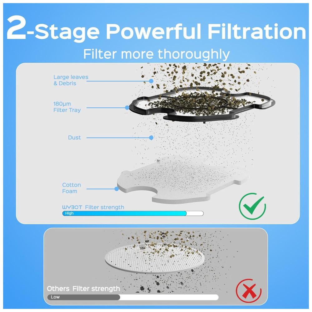 O Aspirador de Piscina WYBOT A1 se destaca com seu excepcional Sistema de Filtração Dupla, combinando um filtro de 180m com uma camada de espuma de algodão, aumentando a eficiência da filtração em 50%. Captura eficazmente uma ampla gama de detritos, incluindo pequenas folhas e areia, elevando a limpeza da sua piscina. Com até 120 minutos de autonomia estendida, cobrindo uma área máxima de 1076 pés quadrados, e um carregamento rápido de 2.5 horas, este robô de piscina sem fio proporciona uma experiência de limpeza rápida e eficiente. Além disso, conta com um sistema de LED dinâmico com cinco cores distintas para atualizações claras de status, e função de limpeza de borda para uma limpeza completa da piscina.