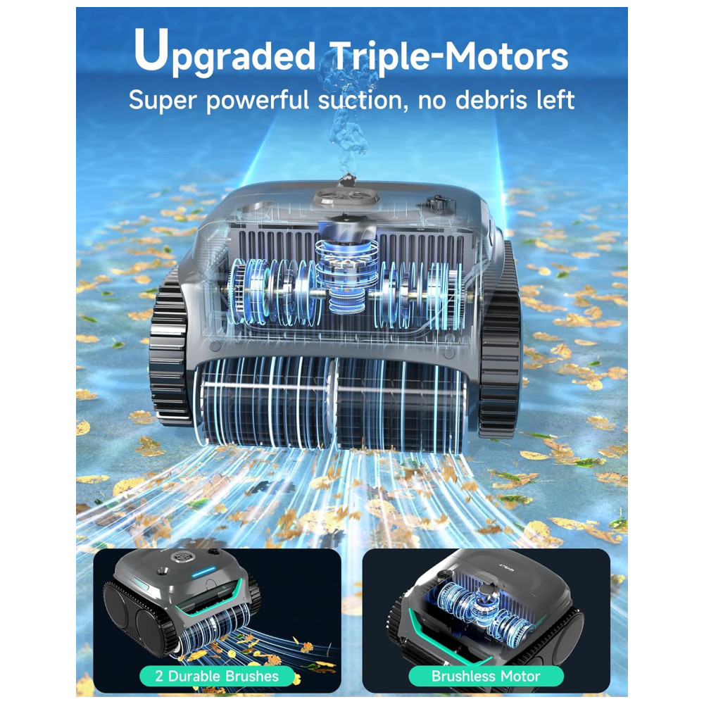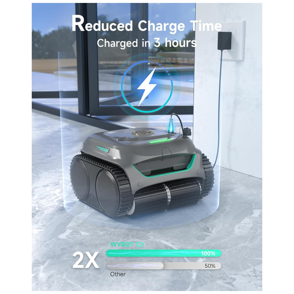 A versão atualizada de 2025 do aspirador de piscina C2 da WYBOT passou por uma reformulação completa de dentro para fora, apresentando um motor de 65W mais potente, sucção aprimorada e sensores de alta precisão integrados. Limpe toda a piscina de forma inteligente com até 180 minutos de autonomia no modo Eco, 60 minutos no modo Turbo. O tempo de carregamento de 3 horas foi reduzido e conta com dupla filtragem com filtragem ultrafina para piscinas mais limpas. Experimente a excelente capacidade de limpeza com este robô aspirador de piscina, projetado com motores de escova dupla e bomba sem escova para esfregar e recolher detritos de forma poderosa. Equipado com tecnologia de navegação avançada, o robô C2 é especificamente projetado para o piso, paredes e linha d’água da piscina, apresentando um sistema de filtragem eficiente que captura facilmente grandes detritos e partículas, incluindo areia, folhas e sujeira teimosa, garantindo que a água da sua piscina permaneça cristalina e pronta para o lazer. Com a dupla filtragem para uma limpeza definitiva, nosso aspirador de piscina é equipado com duas cestas de filtragem avançadas projetadas para diferentes tamanhos de detritos. O primeiro cesto de filtro possui uma malha fina de 180m para interceptar efetivamente folhas e outras grandes partículas de lixo, enquanto o filtro Hepa ultrafino embutido especializa-se em capturar poeira e outras partículas minúsculas, minimizando para 10m para garantir água cristalina. O aspirador de piscina WYBOT C2 oferece 7 modos de limpeza personalizados: Piscina completa padrão, Apenas piso, Apenas parede, Apenas linha d’água, Parede e depois piso, Piso turbo e Piso eco. Seja para uma limpeza completa ou profunda em uma área específica. Além disso, conta com 6 planos de rota e 4 programações de limpeza para escolher. Serviço de atualização OTA contínua para mantê-lo informado sobre as últimas otimizações. Observe que é possível pré-definir um modo enquanto o robô estiver na margem. O aspirador de piscina sem fio C2 da WYBOT funciona com piscinas enterradas ou elevadas, incluindo azulejos, concreto, vinil e fibra de vidro. Limpeza completa da piscina, projetada para o piso da piscina, paredes e linha d’água. Com sistema de estacionamento automático, retorna automaticamente para a beira da piscina para fácil recolhimento.