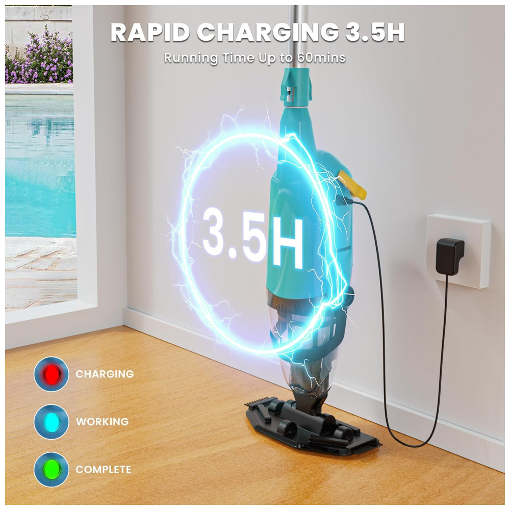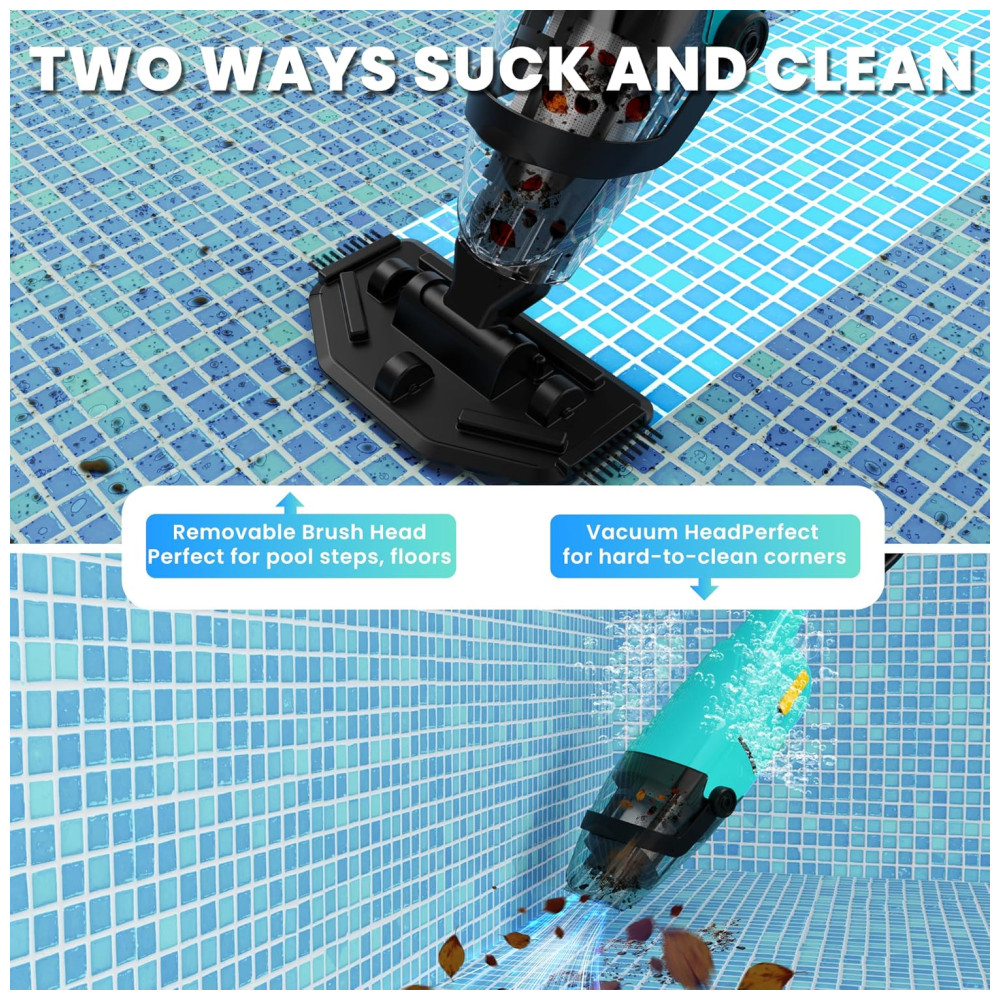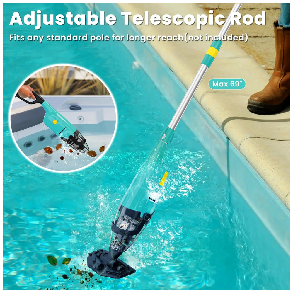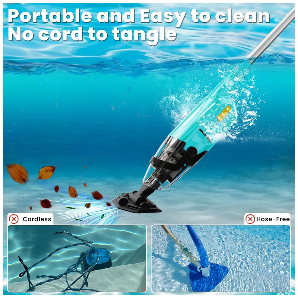 Este aspirador de piscina portátil é ideal para limpeza de piscinas acima do solo, spas e banheiras de hidromassagem. Com um motor forte, ele possui uma sucção poderosa capaz de capturar uma variedade de detritos, incluindo areia e pequenas pedras. A bateria de 6000mAH dura cerca de 60 minutos, proporcionando tempo suficiente para limpar toda a piscina.