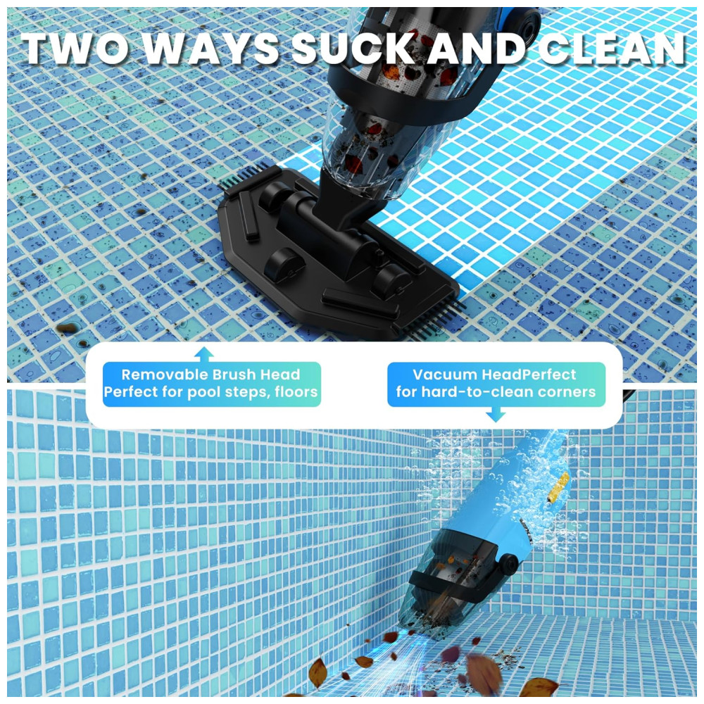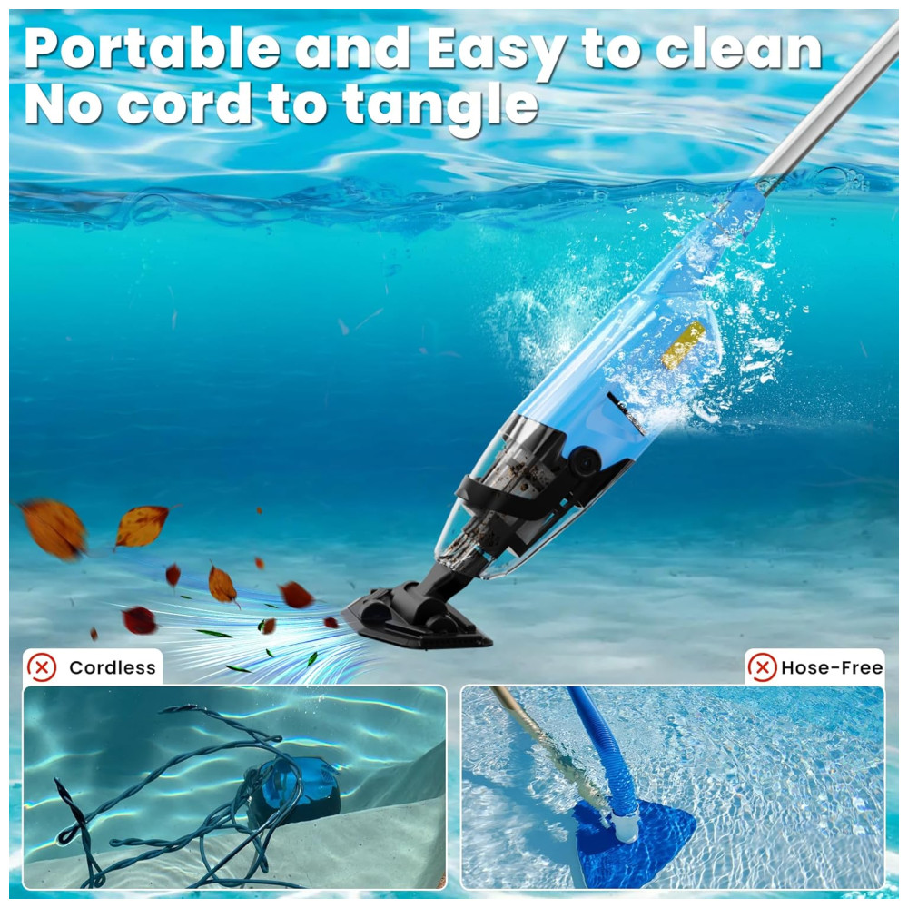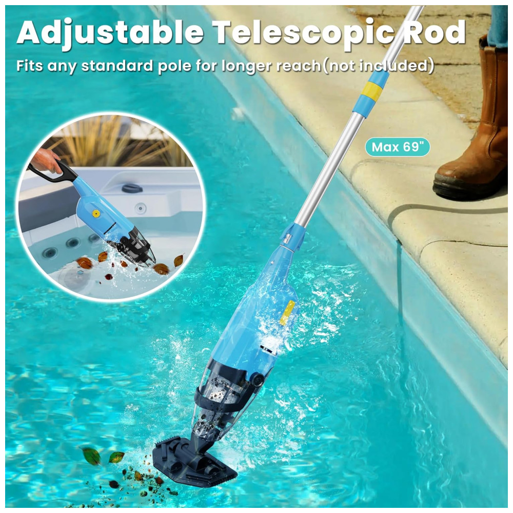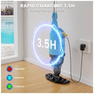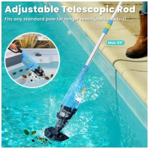 A bateria de 6000mAH permite que o aspirador funcione por até 60 minutos, e é acompanhada por um carregador que leva cerca de 7,58 horas para carregar totalmente a bateria. O aspirador vem com um poste telescópico que pode ser ajustado de 90 a 175 cm, perfeito para limpeza em diferentes tipos de piscinas.