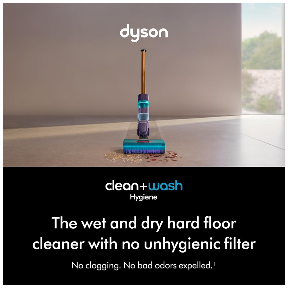 O Dyson Clean+Wash Hygiene é um aspirador de pisos rígidos sem fio que remove sujeira seca e líquida em uma única passada. Ele aspira poeira e detritos como um aspirador e lava derramamentos e manchas com ação capilar, utilizando filamentos densamente compactados para capturar resíduos. O sistema mantém os resíduos na cabeça do limpador, evitando entupimentos.