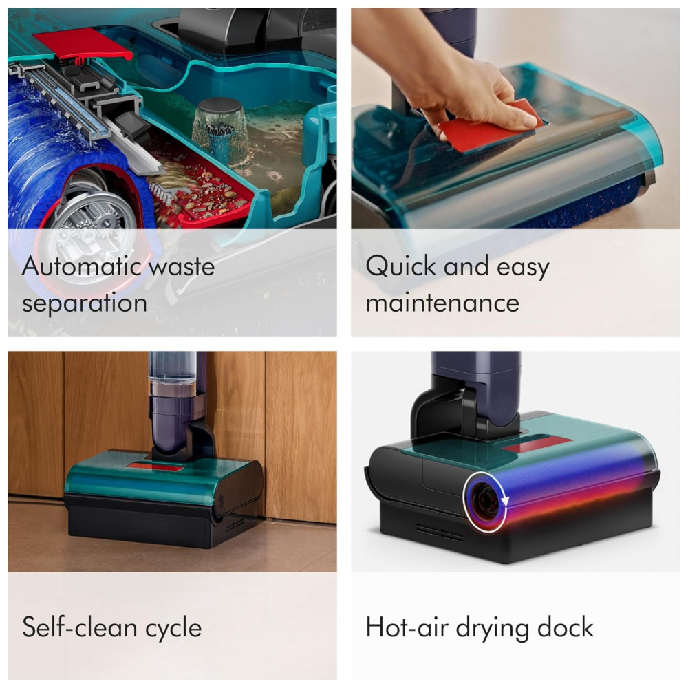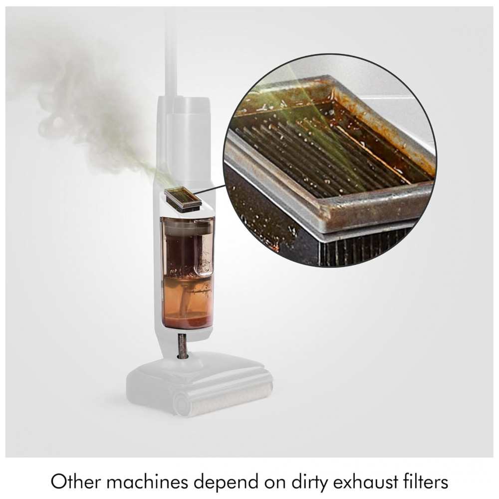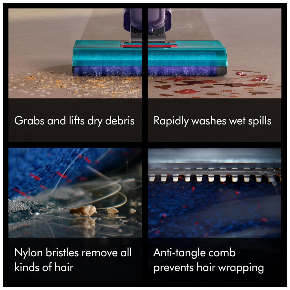 Equipado com rolo de microfibra absorvente com 84.000 filamentos, o aparelho proporciona acabamento sem listras em pisos duros. A barra de escova motorizada gira em alta velocidade para remover sujeira de forma eficiente. Inclui quatro níveis de potência ajustáveis via controle touchpad.