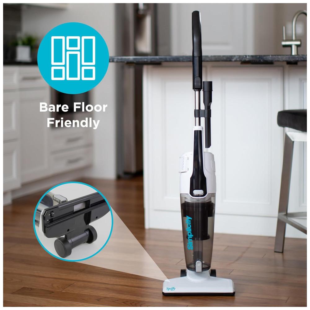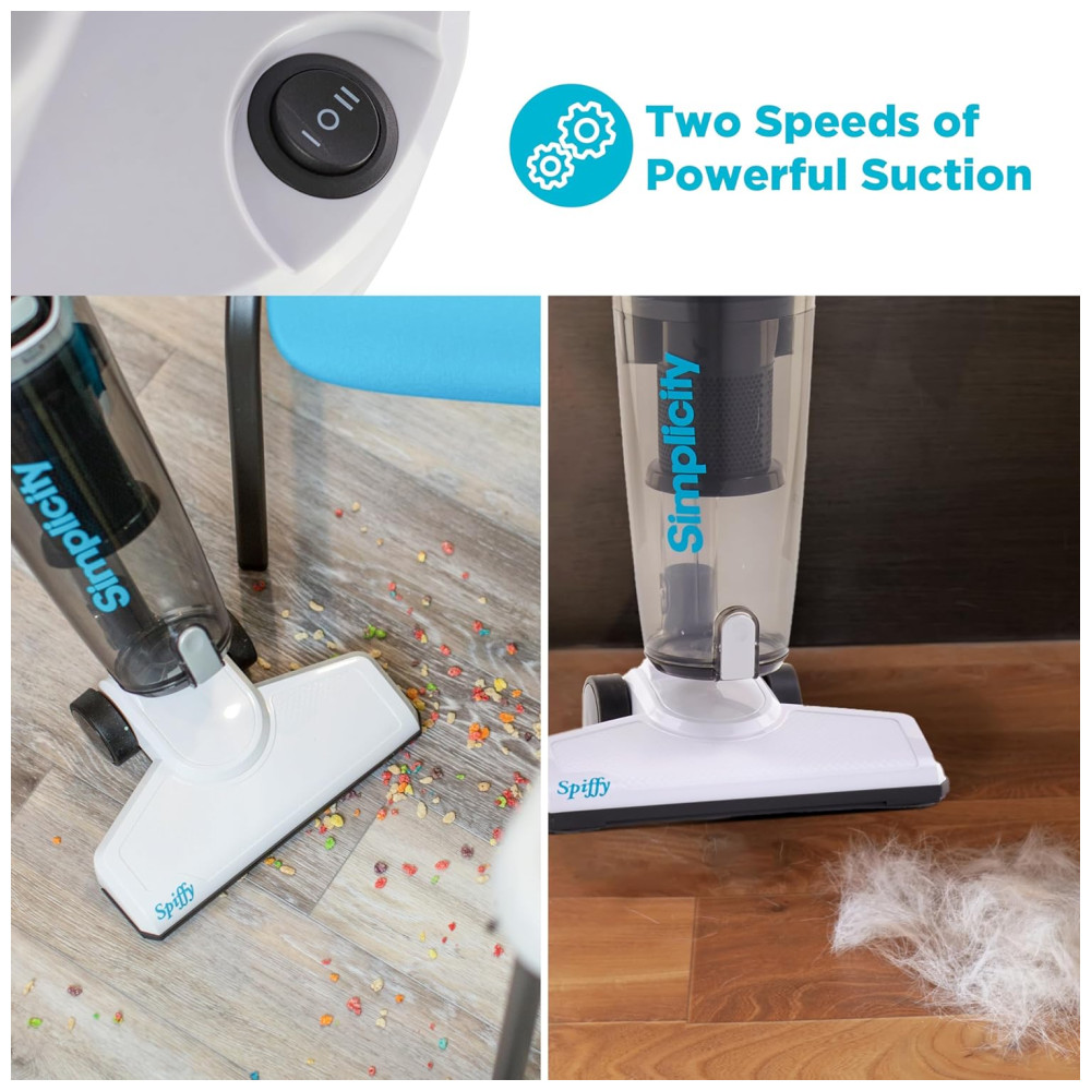 O Simplicity Spiffy S60 é ideal para pisos desencapados, incluindo laminado, madeira, telha e linóleo. Este aspirador é sua solução versátil para limpeza do chão ao teto, garantindo que nenhuma bagunça seja deixada para trás.