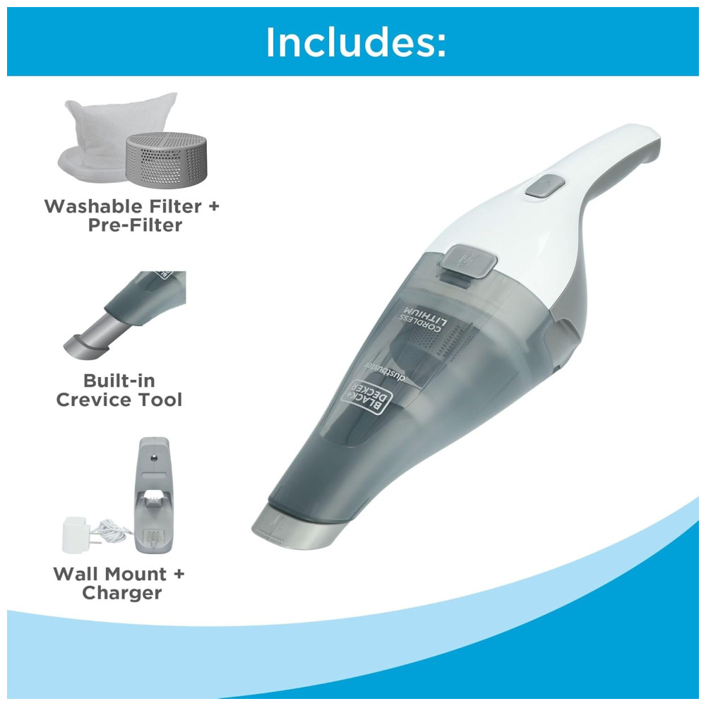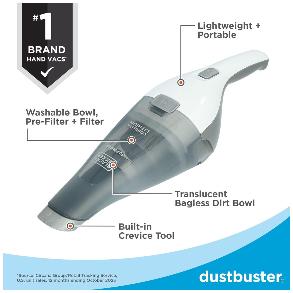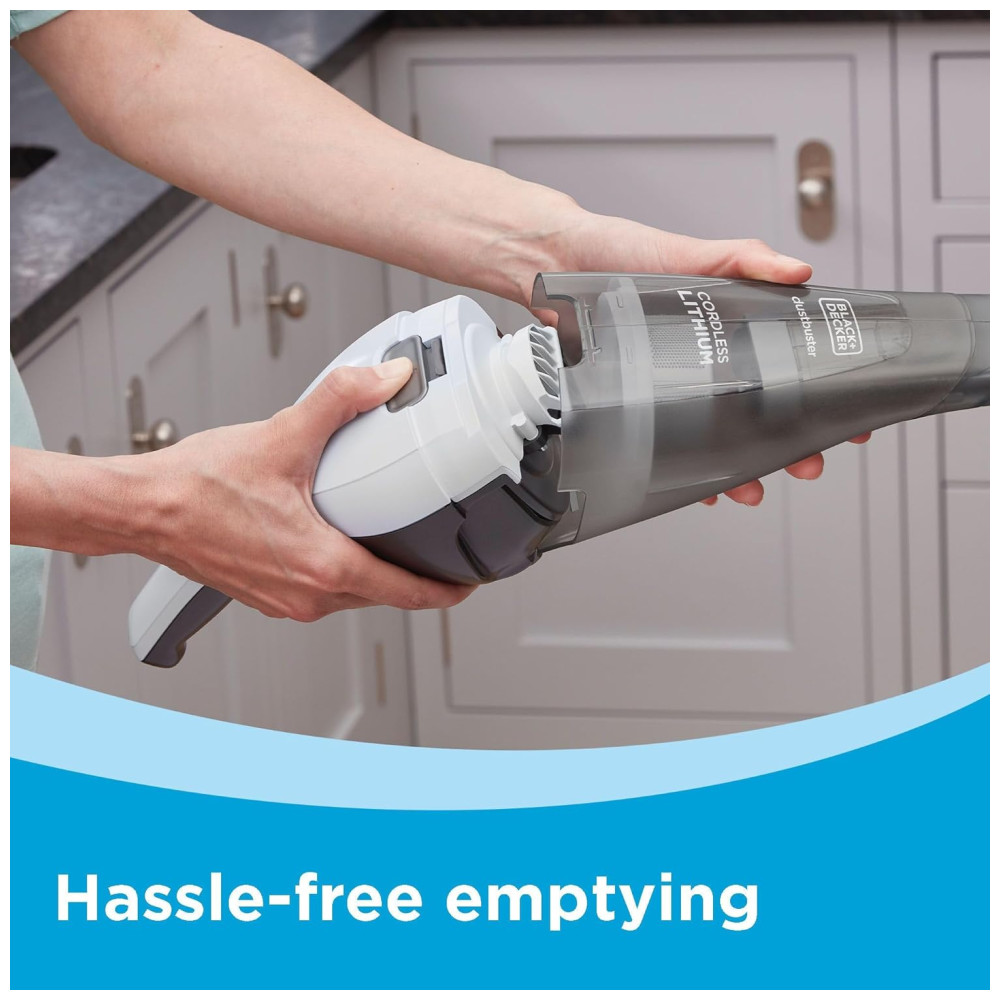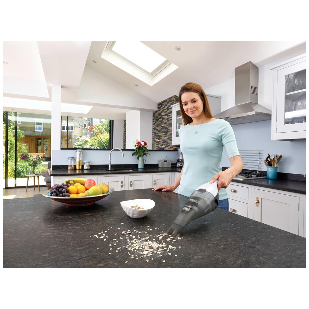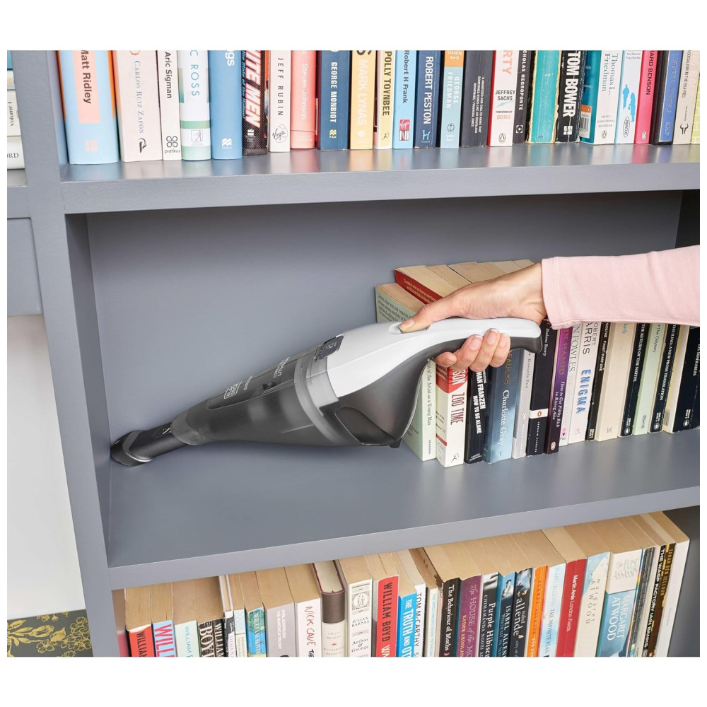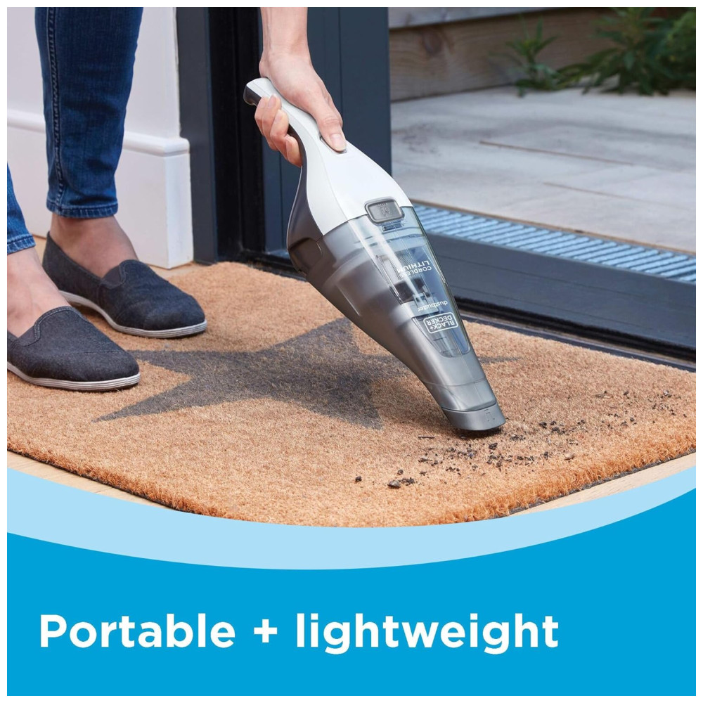 O aspirador de mão Preto + Decker 8V Max Dustbuster, em branco, oferece uma capacidade de Dustbowl de 310 mL, ideal para limpezas rápidas e derramamentos inesperados. Com uma potência de sucção de 15 AW, é eficaz na remoção de sujeira e detritos em diversas superfícies.