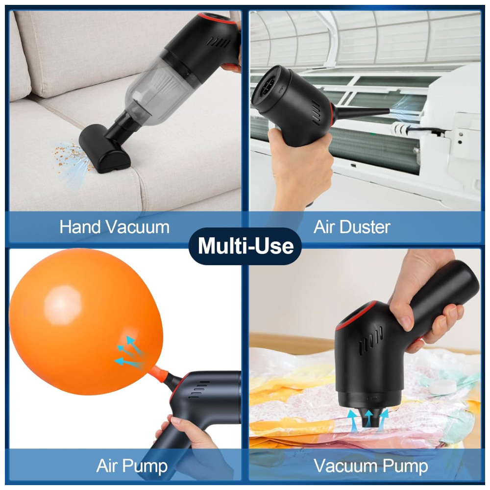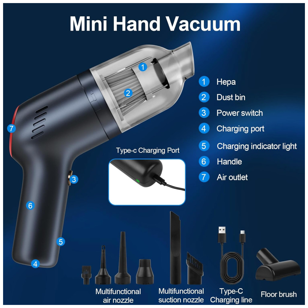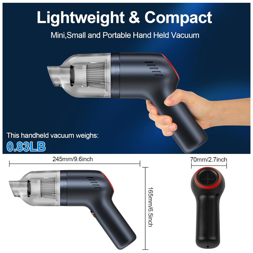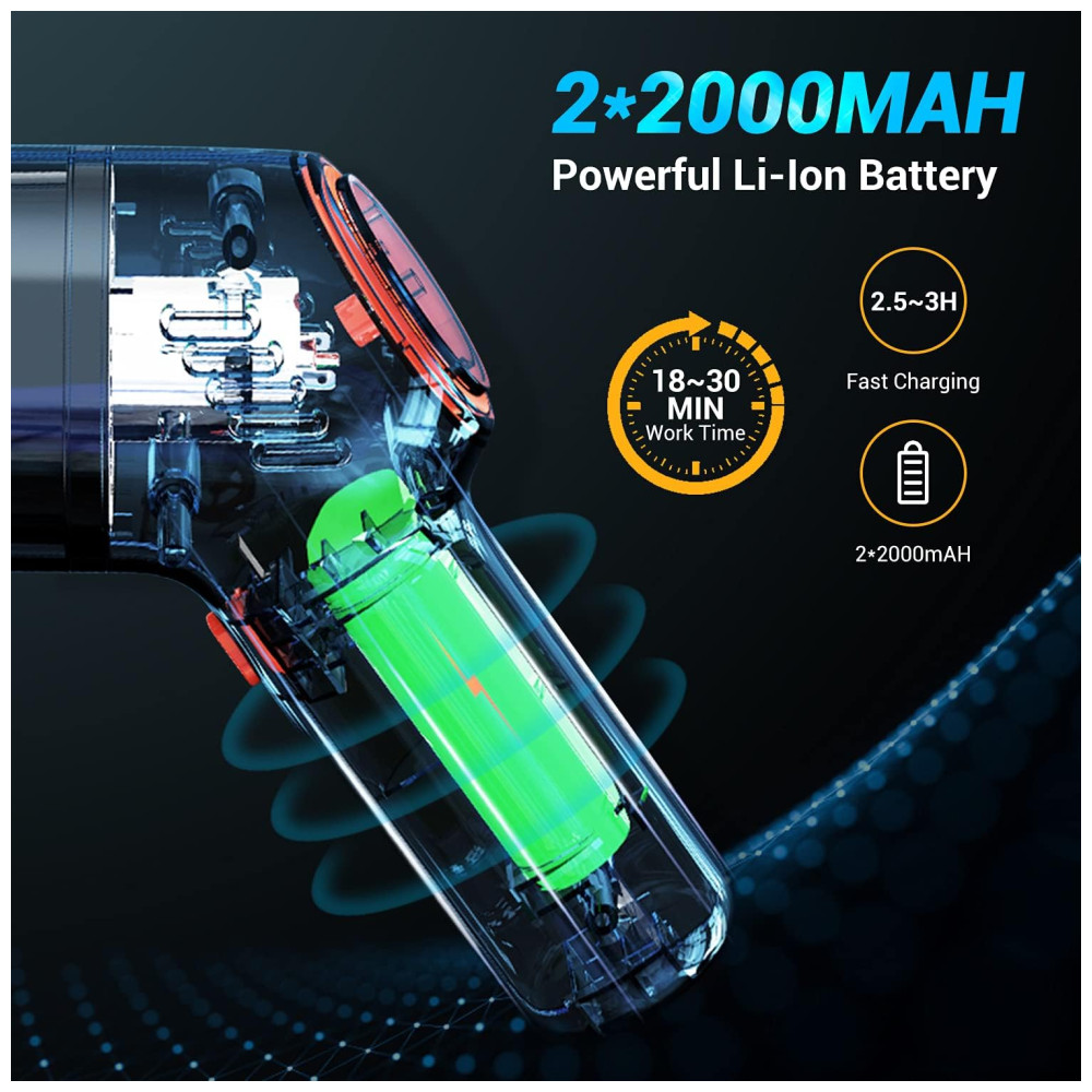 BATERIA DE GRANDE CAPACIDADE O aspirador de mão recarregável possui 2 2000mAh de bateria de lítio recarregável embutida, que pode fornecer um tempo de trabalho contínuo de 25 30 minutos, e pode ser totalmente carregada em 3,5 horas, o que é conveniente de usar.