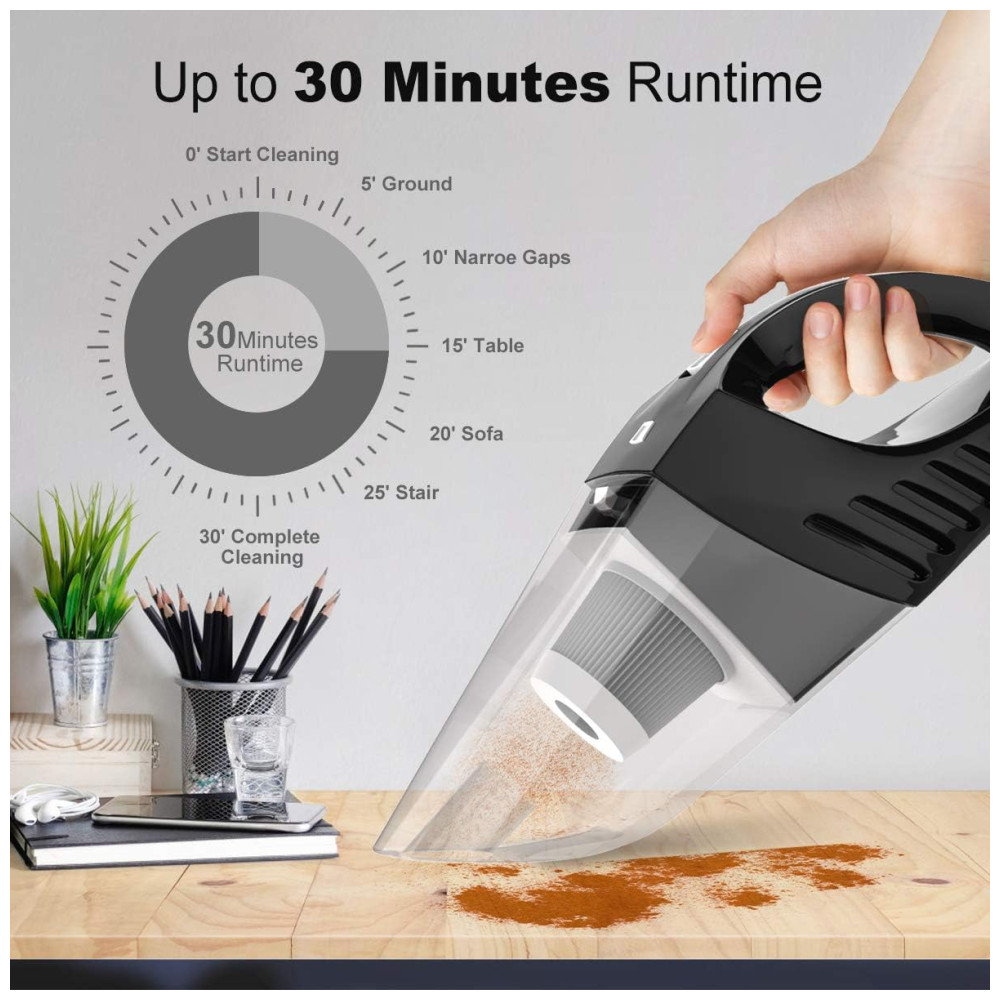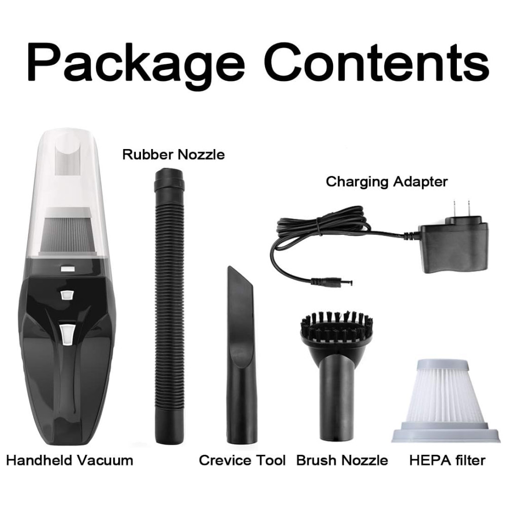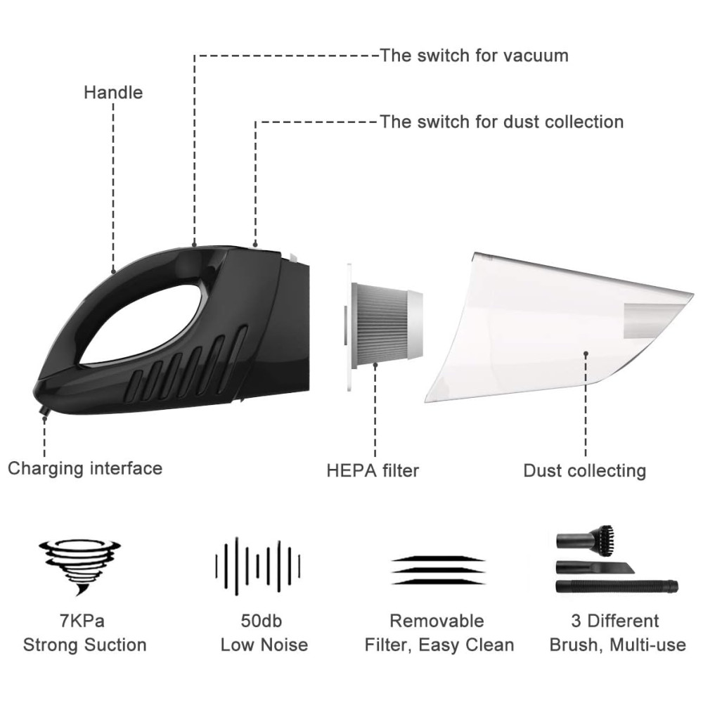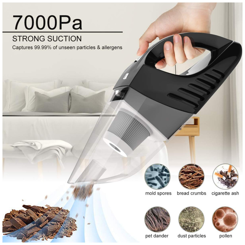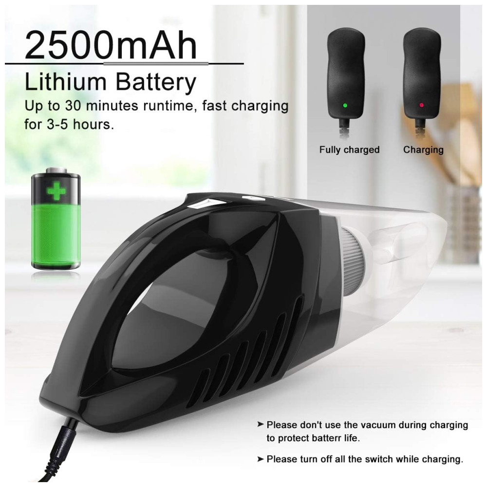 Tecnologia de carregamento rápido e uso a longo prazo o aspirador de pó recarregável é adotado para baterias de íon lítio de alta capacidade de 2500mAh, que leva apenas 4 horas para carregar completamente a bateria e pode operar continuamente por 30 minutos, o recipiente de pó é de 600ML encontra uma profundidade limpeza da cozinha, da sala de estar para o quarto de cerca de 150mt. É sem fio, permitindo a livre circulação de um ambiente para outro. Sucção forte e limpeza profunda utiliza um motor de ultra alta potência de 120W com sucção de até 7Kpa, além de absorver facilmente cabelos, resíduos alimentares, partículas, pelos de animais, cinzas, restos de papel, partículas de poeira invisíveis e difíceis de alcançar, suco, leite e outros líquidos derramados, o vácuo também apresenta excelentes resultados na adsorção de resíduos de menos de 0,1 mícron escondidos no sofá, almofada, colchão etc. Limpeza geral com 3 tipos diferentes de acessórios, o portátil o aspirador ajuda a limpar as costuras dos sofás, cantos das escadarias, fendas de automóveis e outros locais de difícil acesso, seja em casa ou no veículo. O bico da escova é adequado para limpar material de pano e limpar áreas estreitas, como cantos afiados e lacunas estreitas. O acessório do bico da fenda é mais adequado para absorver leite, líquido, bebida e assim por diante. Filtro durável e fácil de lavar o mini aspirador tem três estágios de filtragem para oferecer excelente efeito de filtragem e limpeza de poeira. O filtro de aço inoxidável pode ser destacado e limpo facilmente, o que é mais durável que o filtro comum, melhorando a sucção poderosa, ideal para uma limpeza completa. Aproveite a liberdade de movimento pode ser em casa, carro, cozinha e escritório. O design leve e sem fio ajuda você a aproveitar totalmente a liberdade de movimento e a limpeza fácil onde quer que vá. A alça ergonômica exclusiva com o botão da ponta do dedo, permite controlar a energia sem esforço, e o aspirador com o melhor ângulo de retenção pode controlar facilmente a direção da operação. Especificações Tensão DC 8.4V Potência 120 W force7 kPa Capacidade de poeira 0.6L Decibel 78dB Capacidade da bateria Li ion 2500 mAh Tempo de carregamento 3 4 horas Tempo disponível MAX 30 minutos com tempo total carga Vida útil da bateria 500 vezes Eficiência de limpeza 98 Tipo de uso Seco e úmido Incluído no Pacote. Aspirador de pó, bico de fenda, bico de escova, mangueira macia prolongada, Filtro de aço inoxidável lavável, cabo adaptador