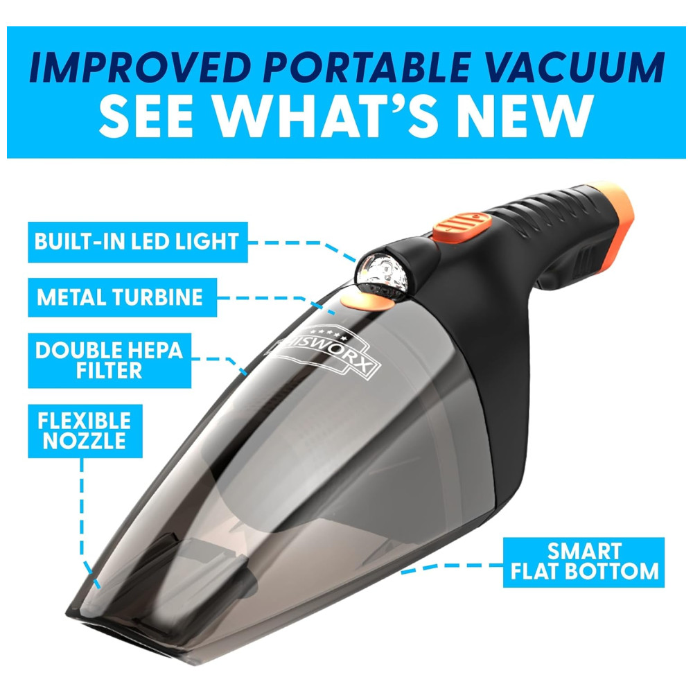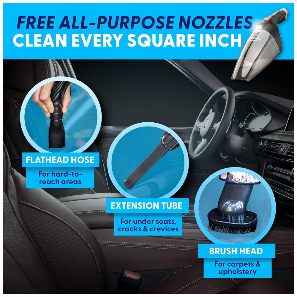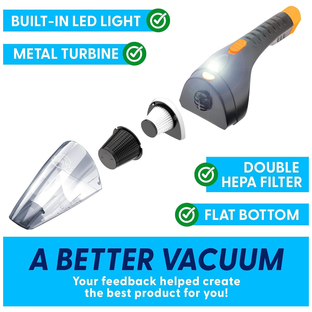O ALTO PODER FINAL Alcançamos um alto padrão em limpeza de carros com nosso aspirador de pó portátil aprimorado. As atualizações incluem potência de sucção de 110 W e 9,s, um design elegante com luz LED integrada e um filtro HEPA duplo lavável