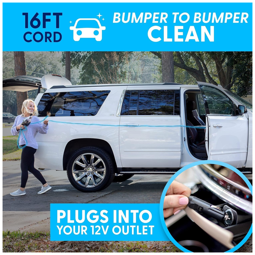 NENHUMA CONFUSÃO É MUITO GRANDE PARA Este Word Nosso mini aspirador úmido e seco faz mágica contra qualquer tipo de sujeira, desde poeira, lama ou migalhas de comida até líquidos derramados, cinzas ou pêlos de animais de estimação. Conecte o na porta do isqueiro de 12 V do seu carro e use o cabo de alimentação de 5 metros para cobrir qualquer área do carro.