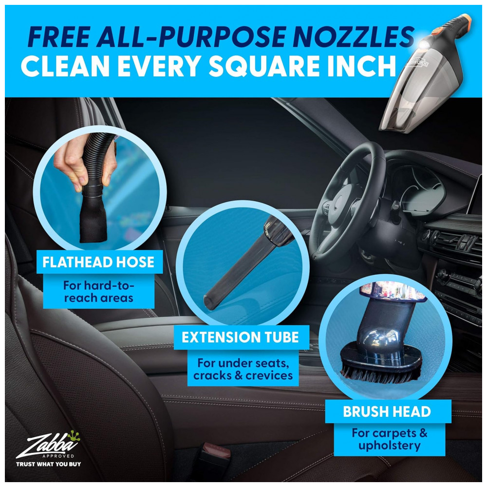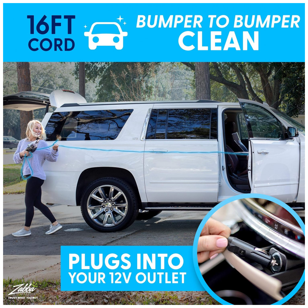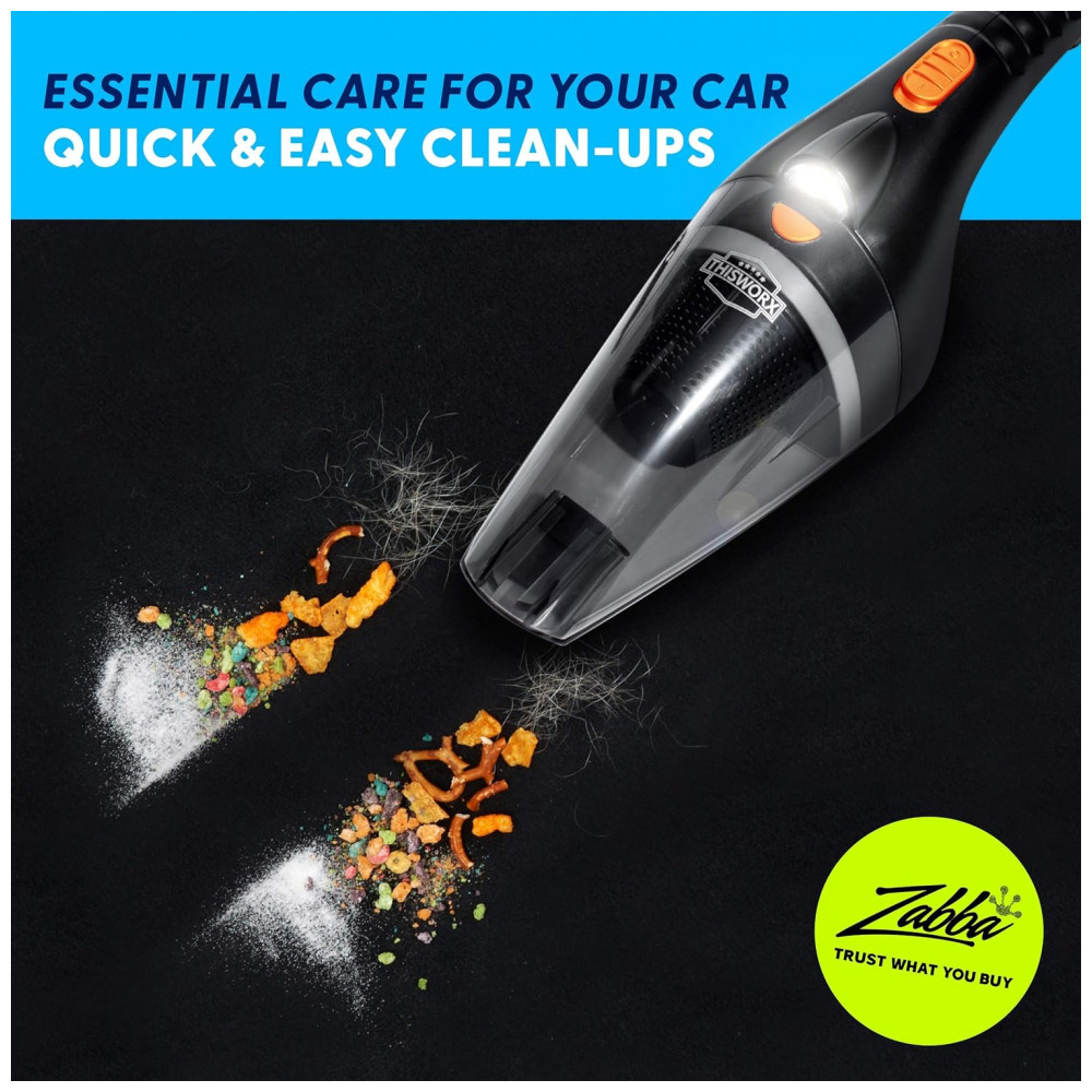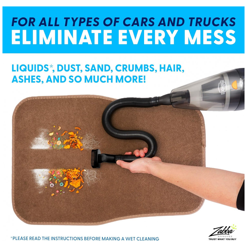 NENHUMA CONFUSÃO É MUITO GRANDE PARA Este Word Nosso mini aspirador úmido e seco faz mágica contra qualquer tipo de sujeira, desde poeira, lama ou migalhas de comida até líquidos derramados, cinzas ou pelos de animais de estimação. Conecte o na porta do isqueiro de 12 V do seu carro e use o cabo de alimentação de 5 metros para cobrir qualquer área do carro.
