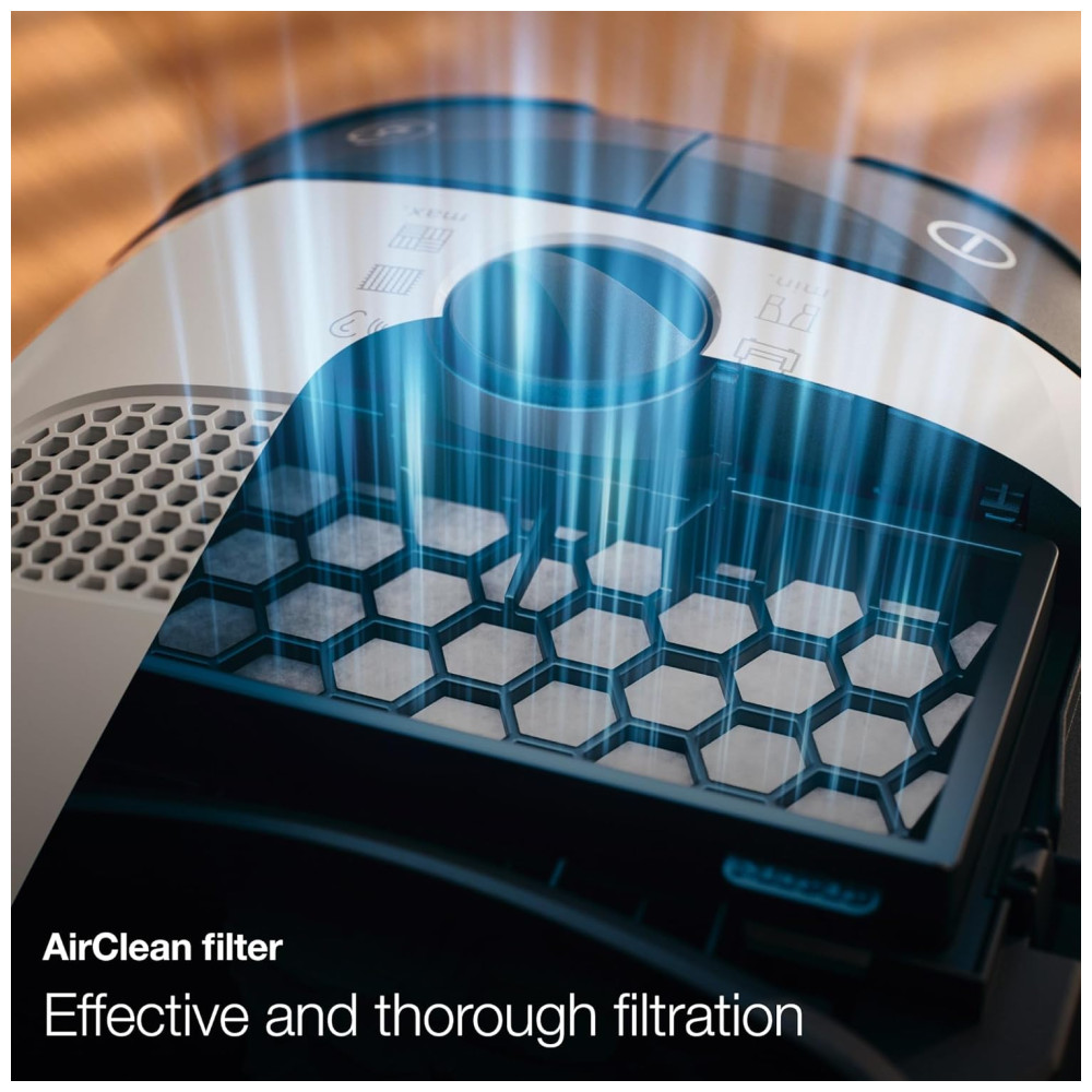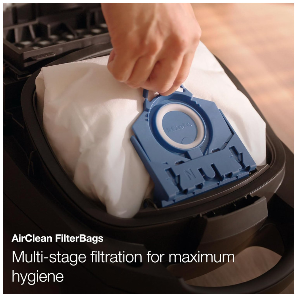 SISTEMA AIRCLEAN: O exclusivo sistema de filtragem de 3 camadas da Miele, composto por saco de filtro Miele, filtro de proteção do motor e filtro de exaustão AirClean, garante que o ar ambiente fique mais limpo após a aspiração do que antes.