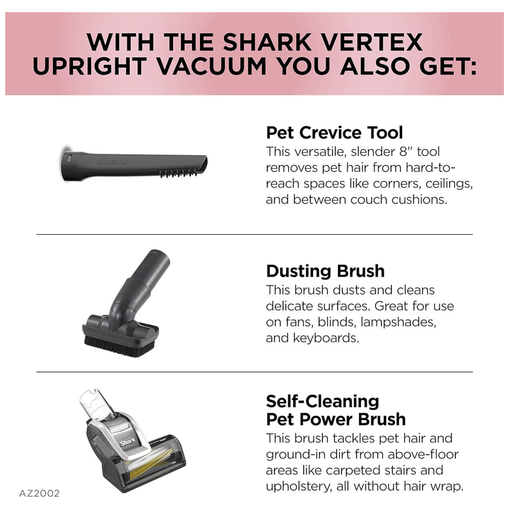 O QUE ESTÁ INCLUÍDO: Aspirador Vertical Shark Vertex, Ferramenta de Fresta para Pets, Escova para Poeira, e Escova de Poder Pet Autolimpante.