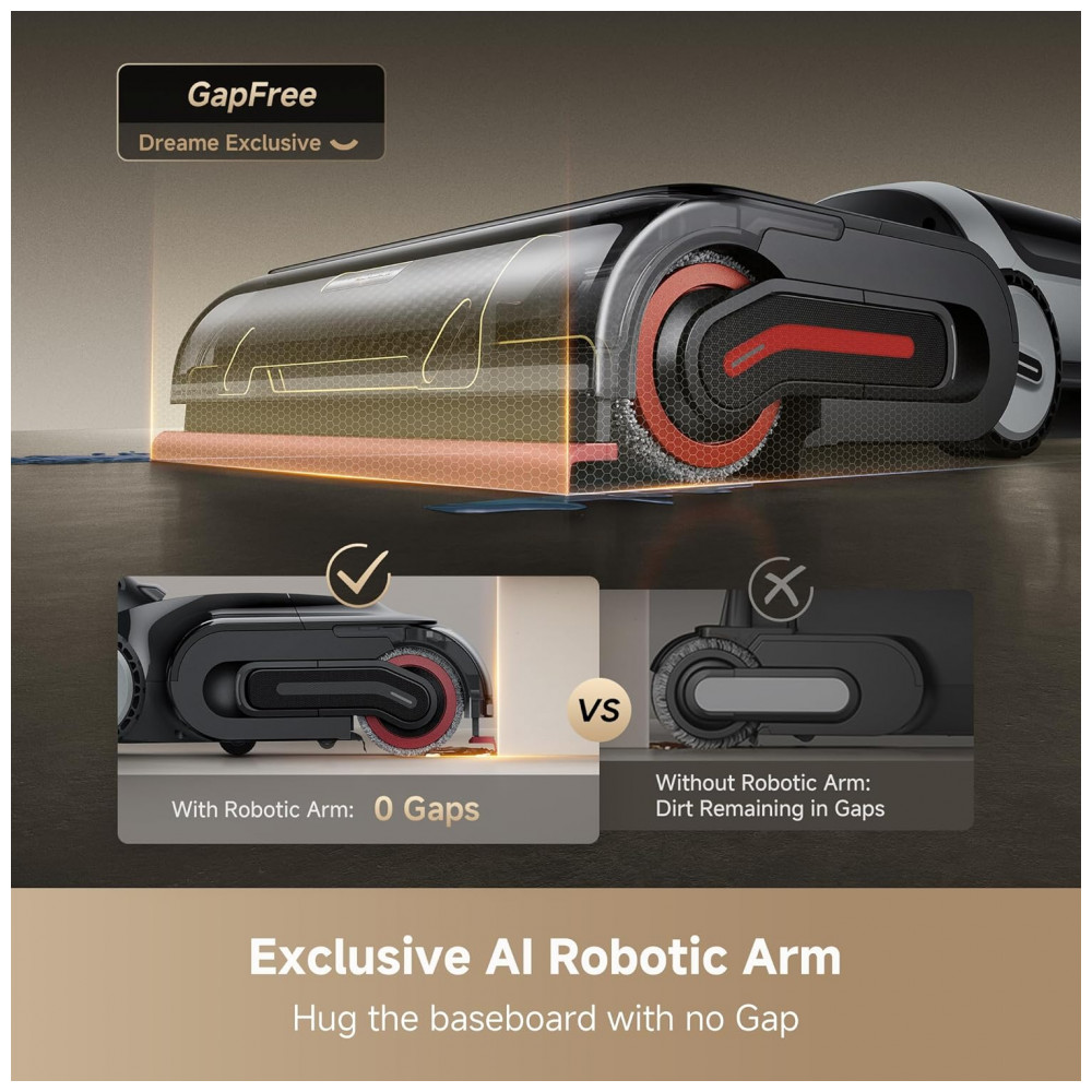 Característica Especial: Limpeza Inteligente a 180 graus, Limpeza de Chão com Água Quente a 185F, Braço Robótico AI DescendReach, Alta Sucção e até 72min de Duração da Bateria, Raspador TangleCut,