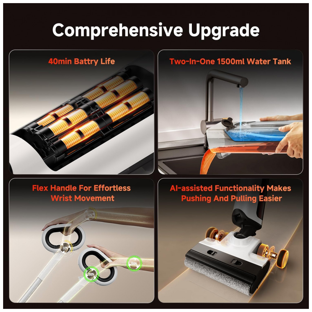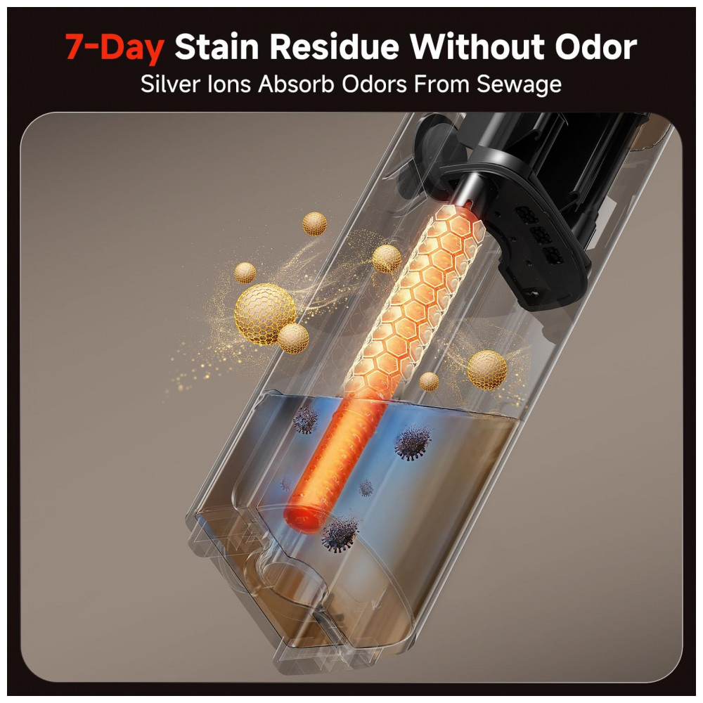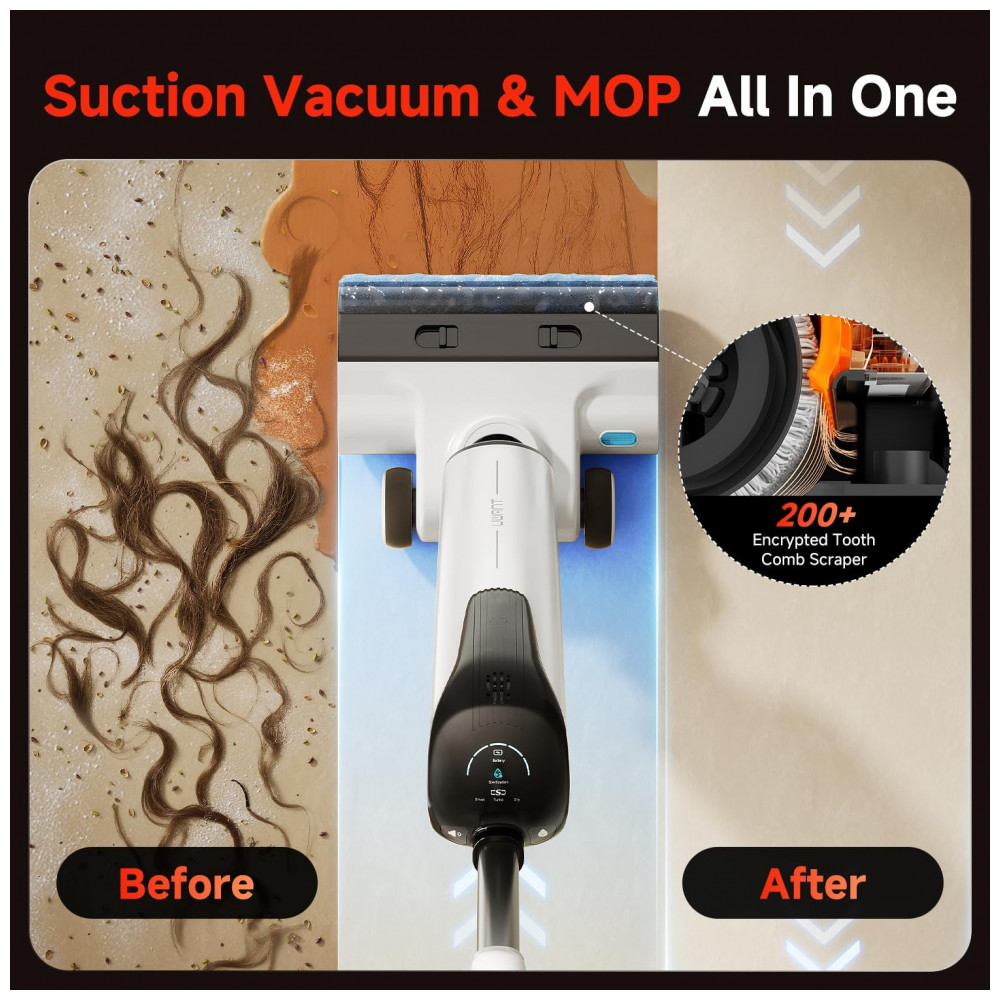 Desfrute de um desempenho de limpeza incomparável com nosso aspirador de pó e água, projetado para simplificar sua vida enquanto mantém sua casa impecável. Com sucção ultrapotente de 18000Pa, essa máquina versátil lava e aspira simultaneamente, deixando seus pisos brilhantemente limpos e sem marcas. O design inovador 180 layflat e a limpeza com bordas duplas garantem que nenhuma sujeira seja deixada para trás, mesmo em lugares de difícil acesso como embaixo de sofás, camas e cantos apertados. Seja na sala de estar, cozinha, quarto, banheiro ou pátio, a bateria sem fio e de longa duração fornece a energia necessária para uma limpeza fácil em toda a casa. Ao contrário dos aspiradores comuns, nosso aspirador mop para pisos duros possui um sistema embutido de remoção de odores, garantindo um ambiente fresco e agradável, mesmo que você ocasionalmente esqueça de esvaziar o tanque de água suja. Aproveite a manutenção sem complicações com seu sistema automático de autoclean em dois passos e secagem de baixa temperatura, liberando suas mãos enquanto prolonga a vida útil da máquina. Além disso, o design à prova d’água IPX6 permite enxaguar todo o dispositivo, por dentro e por fora, para uma limpeza profunda e higiene duradoura. Perfeito para famílias, donos de animais de estimação e qualquer pessoa em busca de uma forma mais inteligente de limpar, esse aspirador de piso duro combina potência, conveniência e durabilidade para atender a todas as suas necessidades de limpeza. Atualize para nosso VacMop hoje e transforme sua experiência de limpeza!