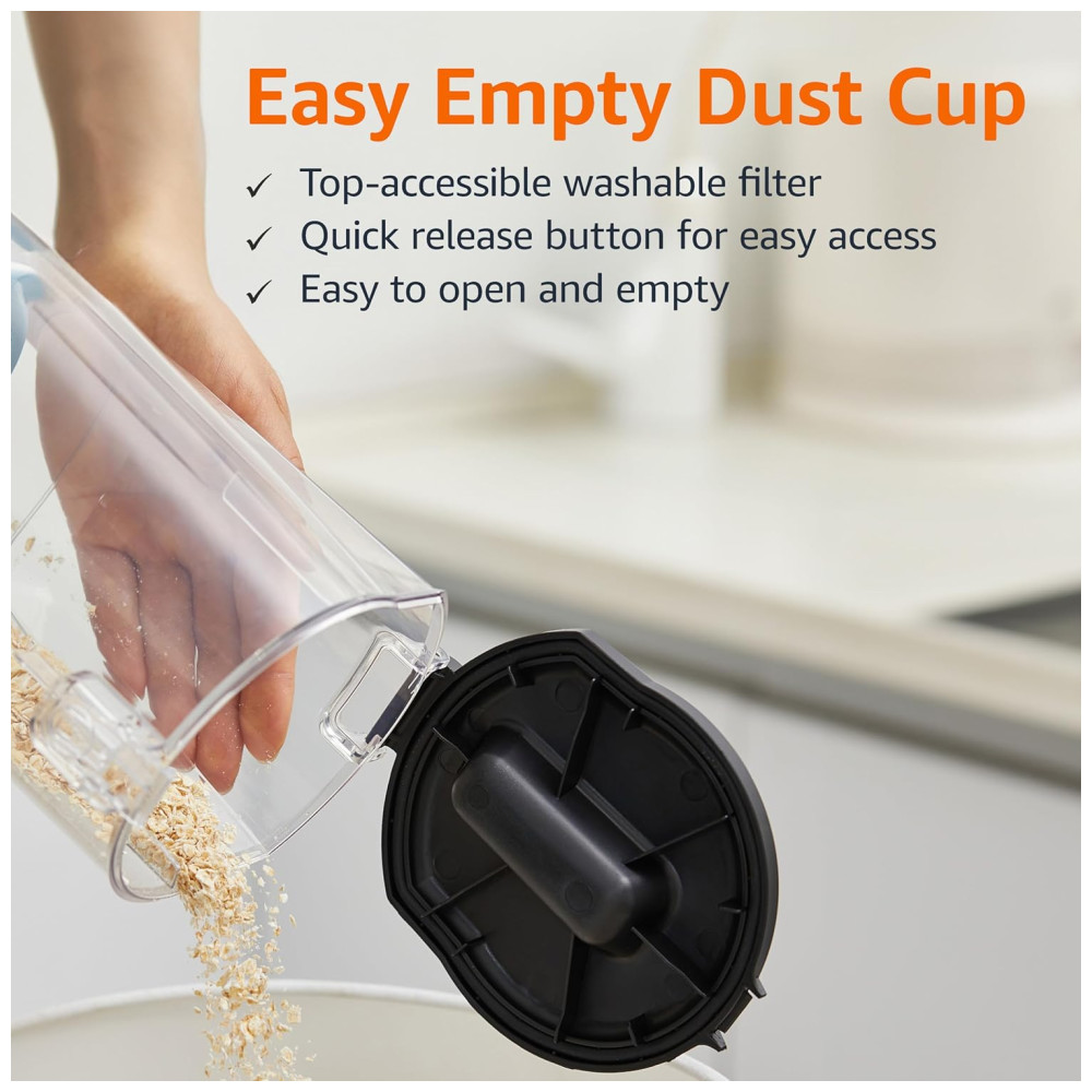 O coletor de pó é grande, permitindo que você aspire por mais tempo sem interrupções, e ainda conta com um botão de liberação rápida para facilitar o esvaziamento. O filtro lavável também é uma ótima vantagem deste produto.