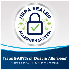 Sistema Selado HEPA: Garanta um ambiente mais saudável para sua família. O sistema selado com filtro HEPA captura 99,97% de alérgenos e partículas finas, impedindo que estes voltem ao ar da sua casa.