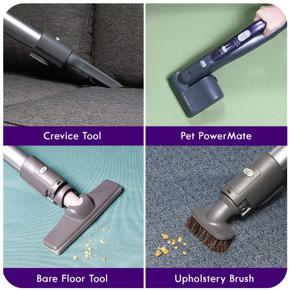 Pet PowerMate & Escova Pop-N-Go: O acessório motorizado levanta rapidamente pelos teimosos pelos de animais e sujeira de superfícies. Elimina o emaranhamento de pelos ao redor da escova. Armazena dentro do aspirador, fixa-se à alça e à haste em um instante para limpeza de pisos nus.