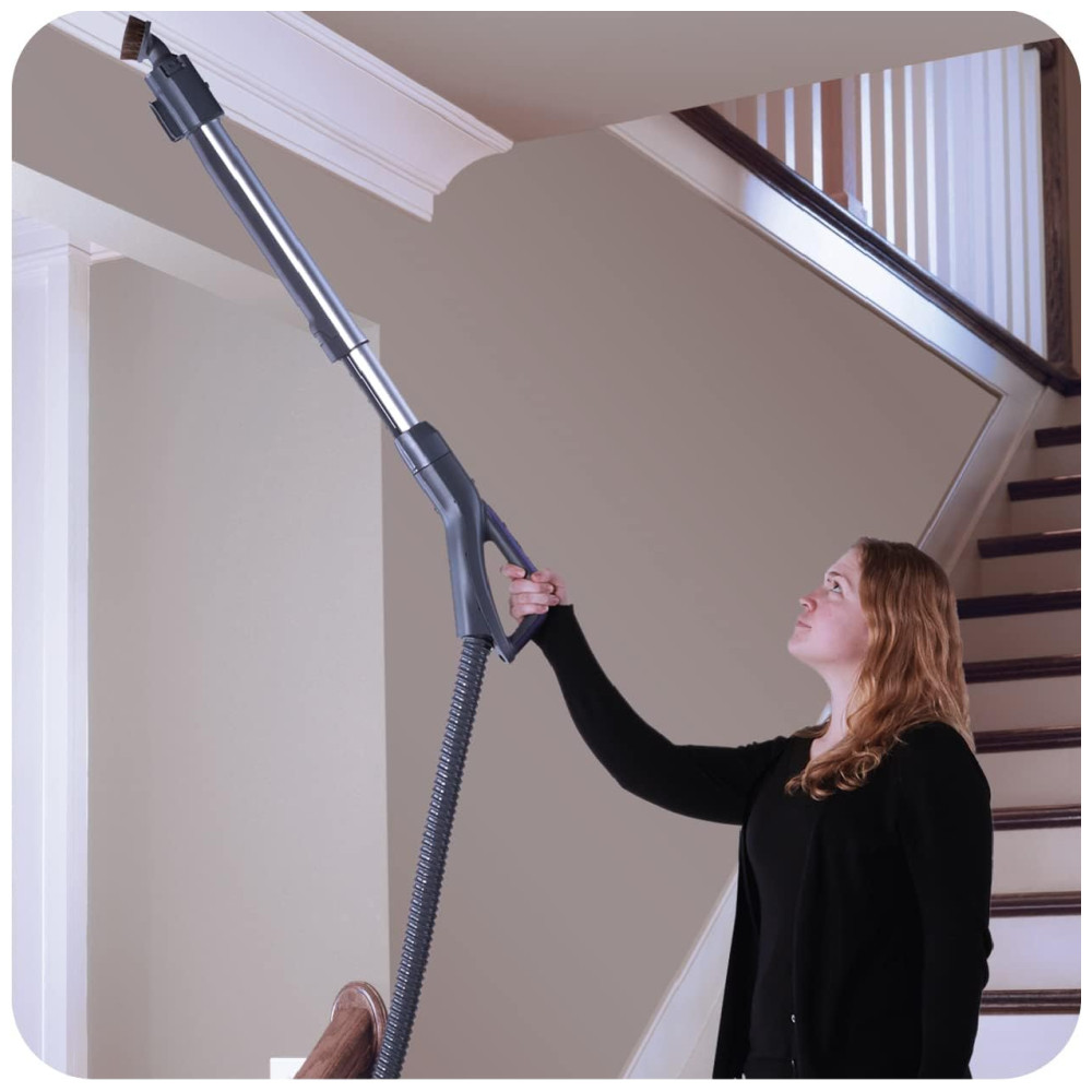 Haste de Alumínio Telescópica: Haste leve ajustável que se estende até um alcance estendido de 3,05 metros para acessar áreas difíceis. Leve, pesando 10,25 kg, com cabo de 8,53 metros retrátil. Acessórios e anexos cabem dentro do aspirador.