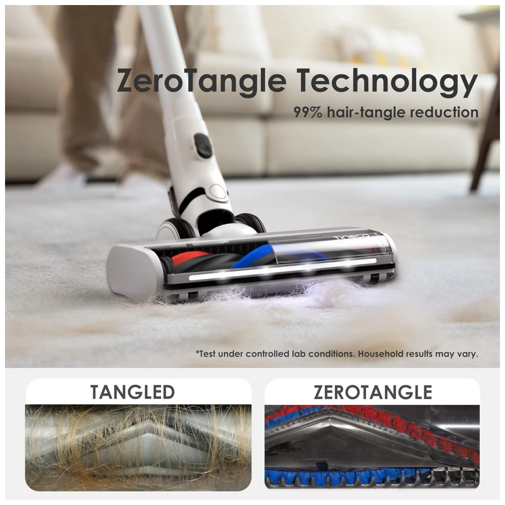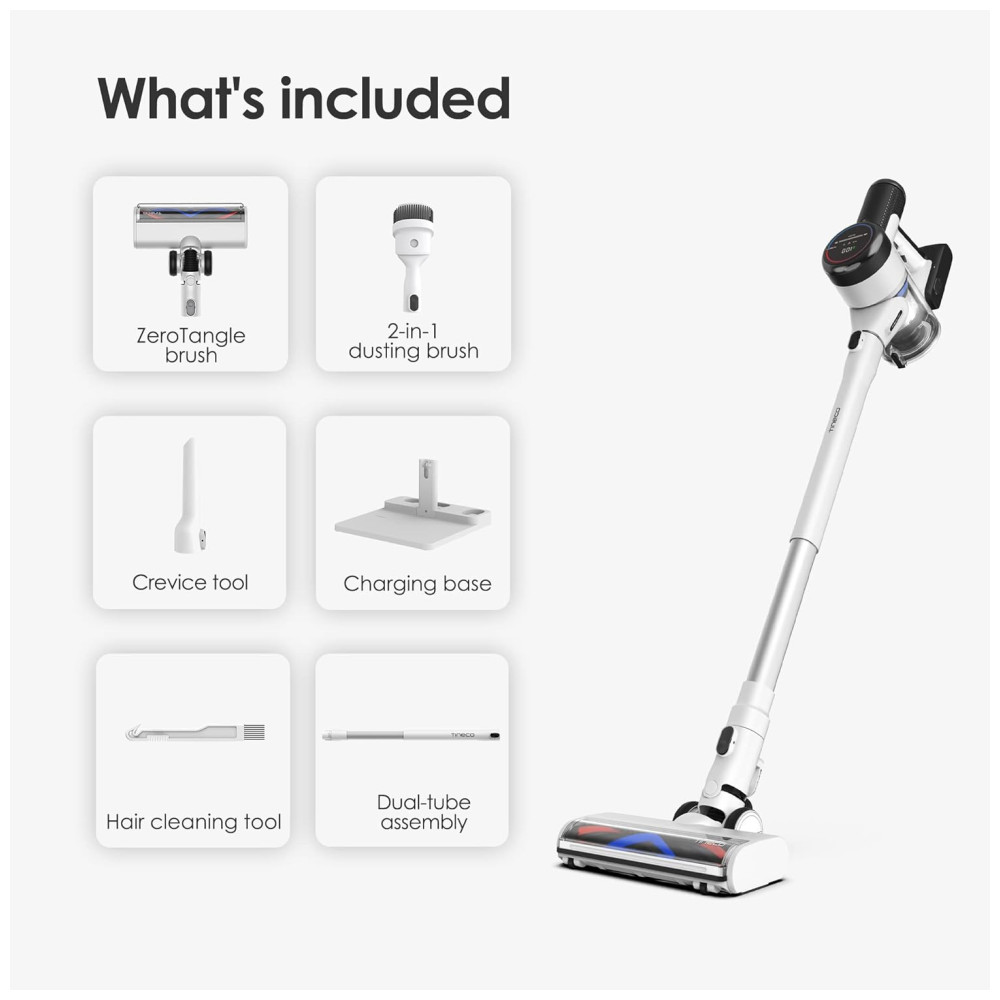 Componentes Inclusos: Escova ZeroTangle, escova para poeira, ferramenta para frestas, base de carregamento, ferramenta de limpeza de cabelos, montagem de tubo duplo