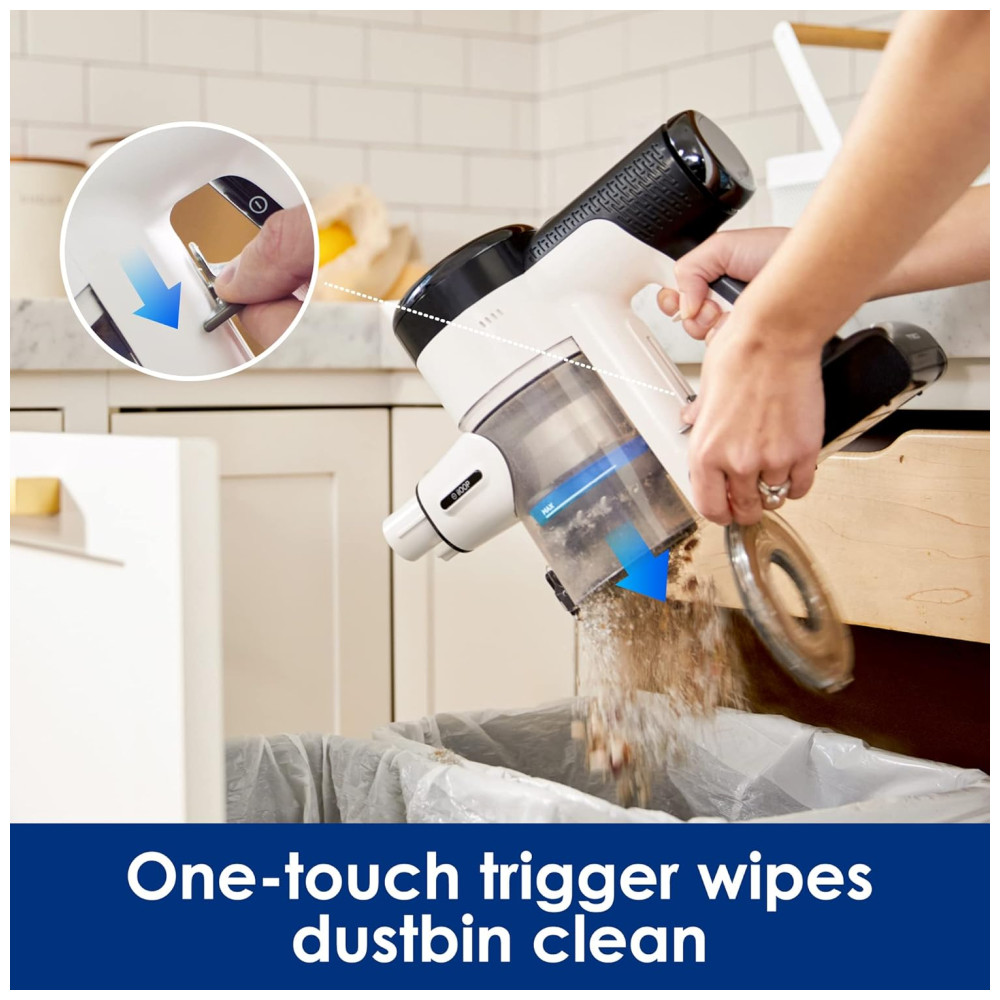 Gatilho de Limpeza com um Toque: Com um simples pressionar de um botão, o gatilho de um toque raspa o pó e os cabelos do coletor de poeira, empurrando os detritos diretamente para o lixo.