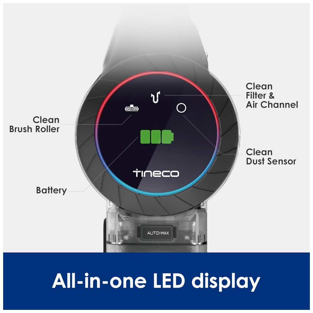 O visor LED colorido e o aplicativo Tineco conectado monitoram o progresso da limpeza, os níveis de bateria e o desempenho da sucção para uma experiência de limpeza inteligente.