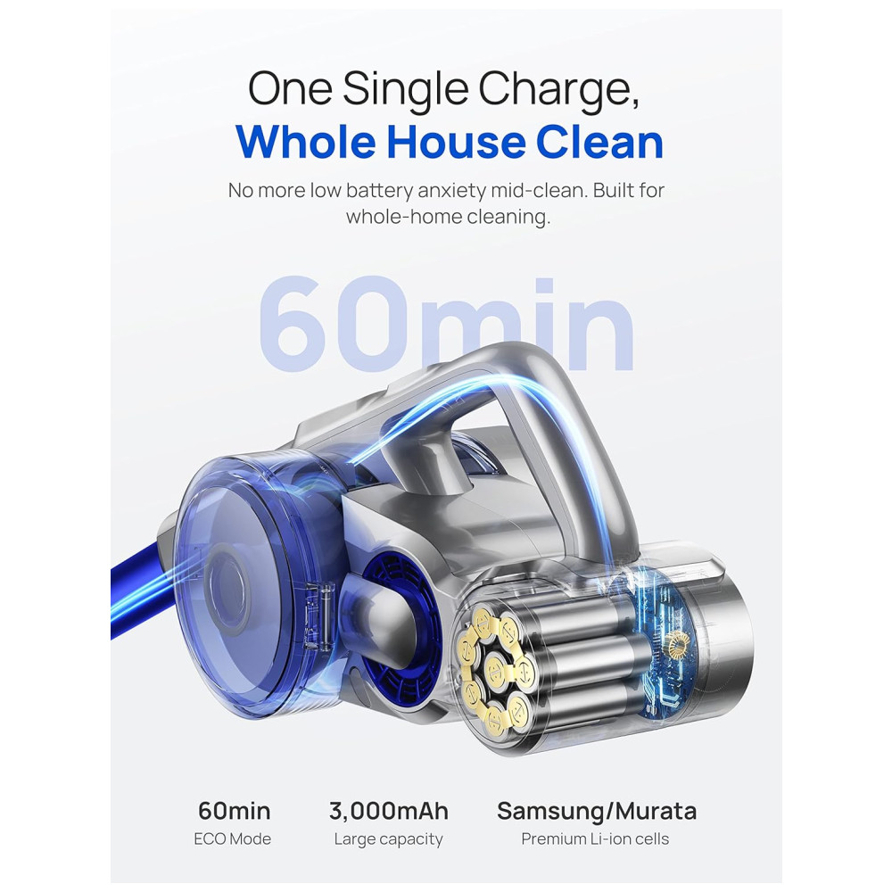 Autonomia de 60 minutos: Limpe toda a sua casa com uma única carga, sem interrupções ou cabos. A bateria de íon de lítio do aspirador Dreo proporciona uma limpeza potente e duradoura que se mantém por anos.