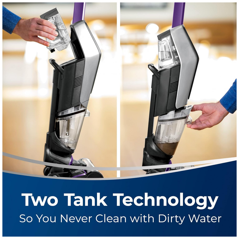 Tecnologia de Dois Tanques. Mantém água limpa e fórmula separadas da água suja, pelos de animais de estimação, sujeira e detritos.