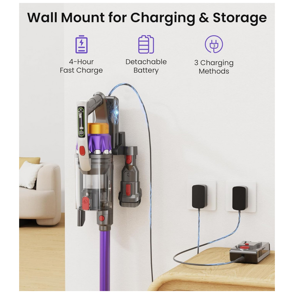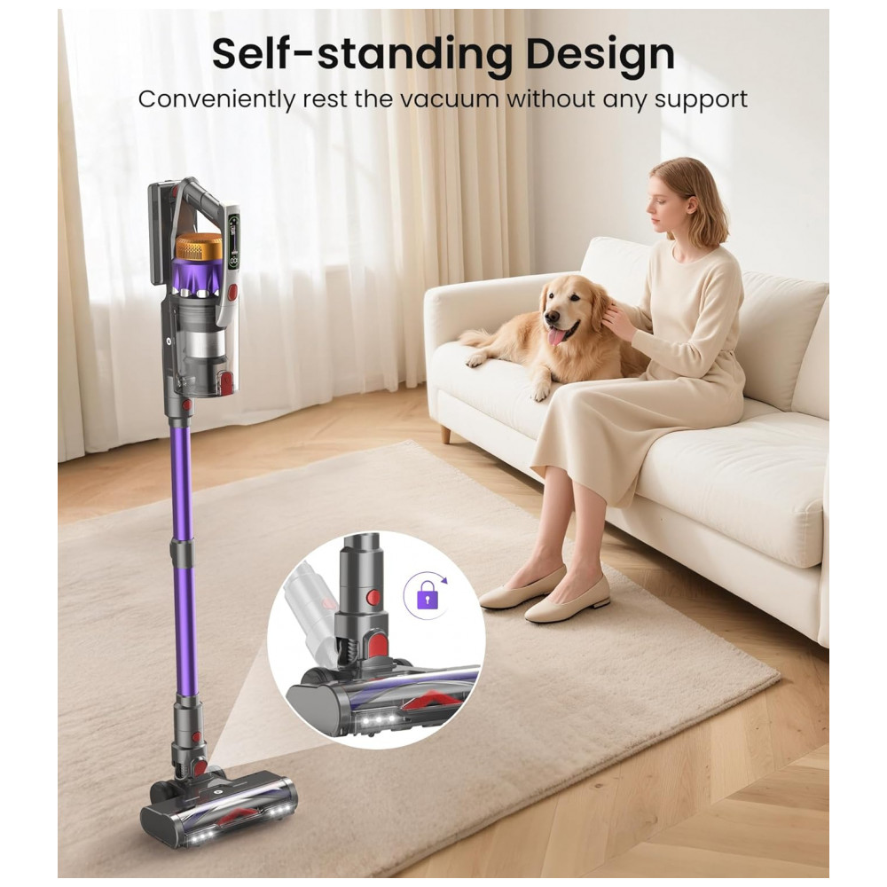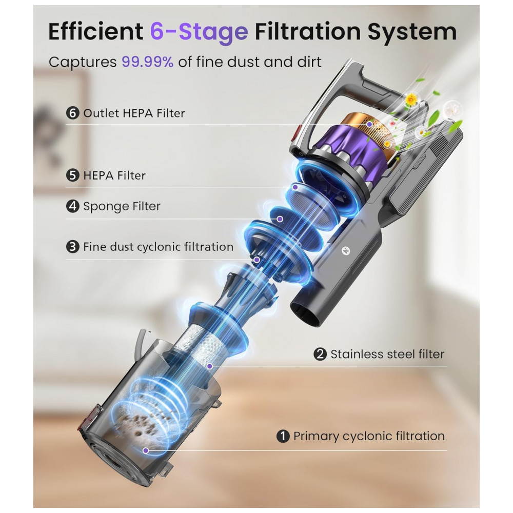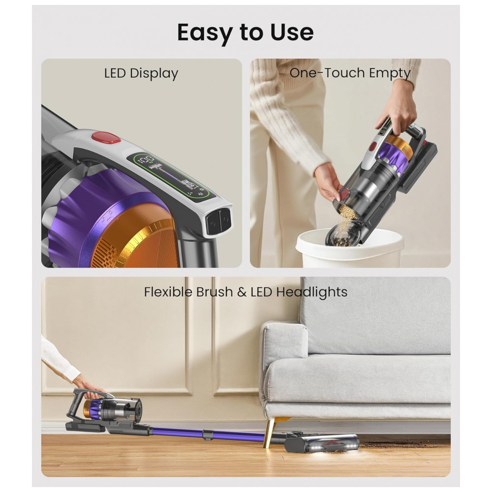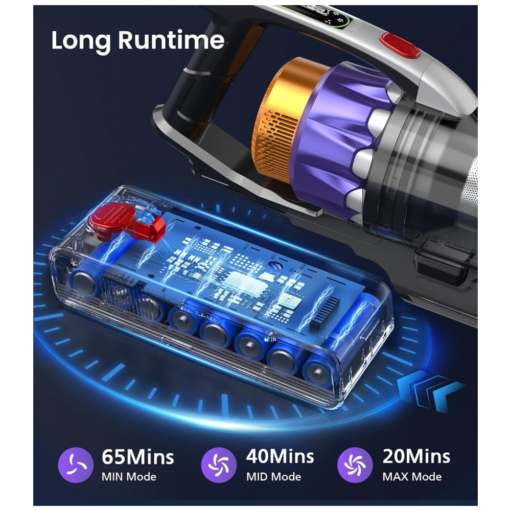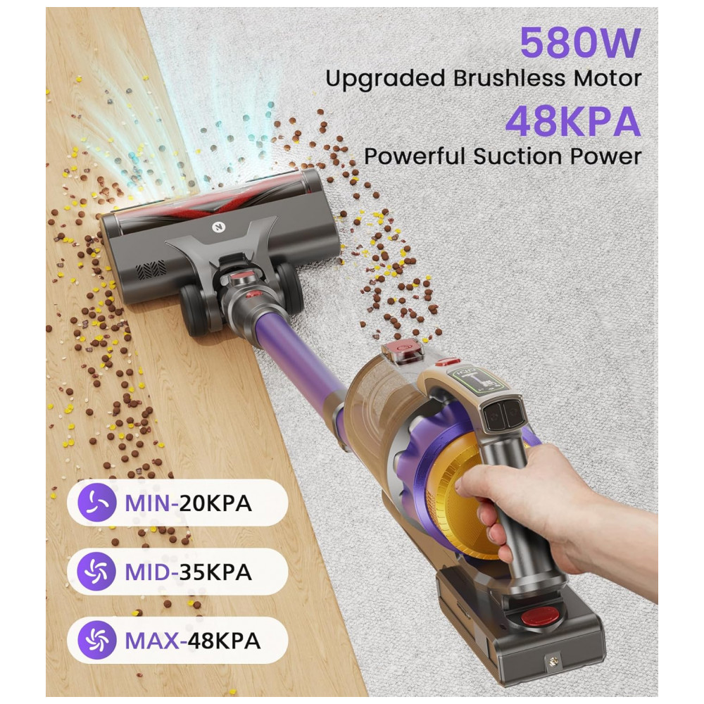 Special Feature: Motor brushless de 580W, sucção potente de 48KPA, até 65 minutos de autonomia, escova flexível anti-emaranhado, design autônomo, leve, copo de poeira de 1,8L, 3 modos de sucção, haste telescópica ajustável, acessórios práticos, escova motorizada LED,
