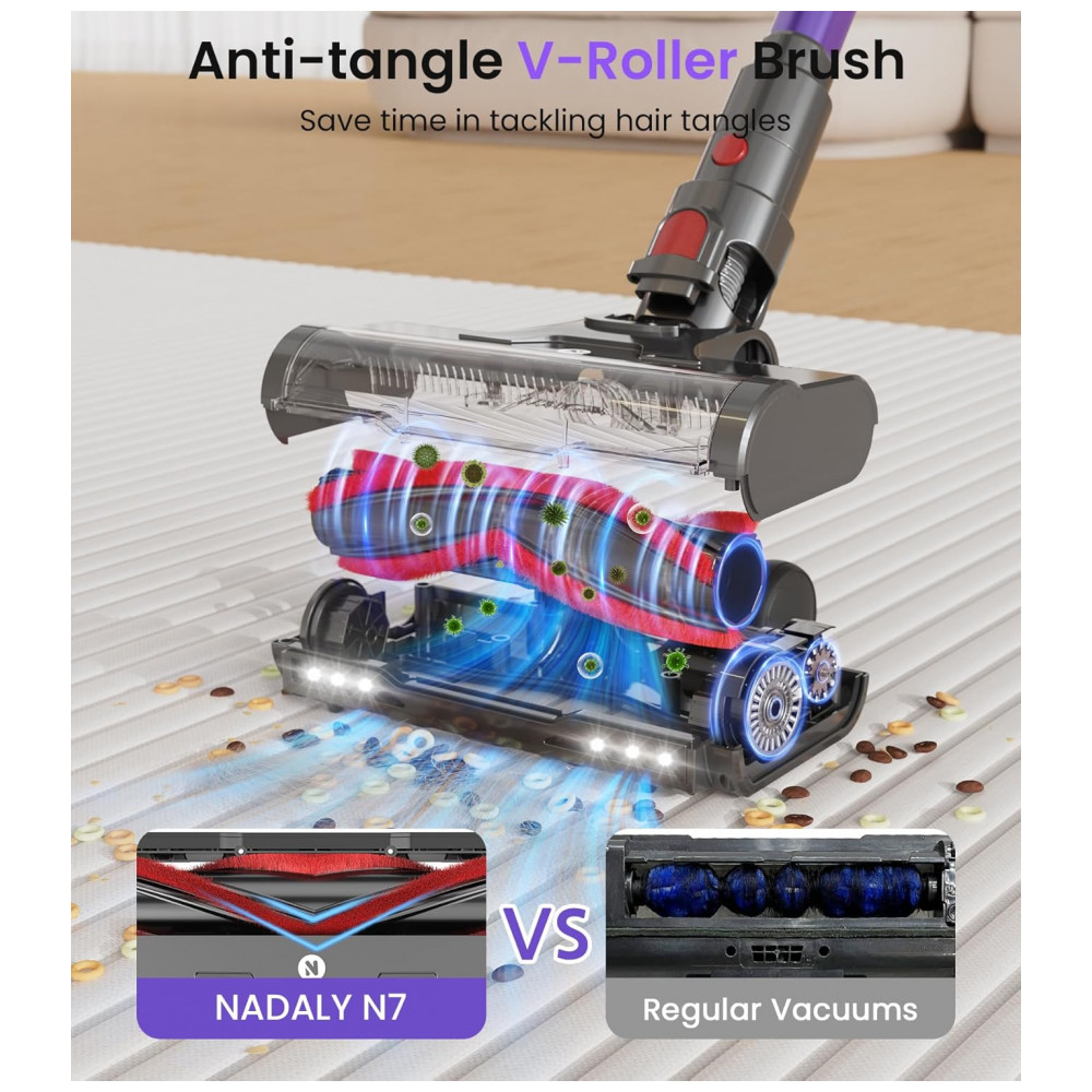 Desfrute de uma limpeza poderosa com o aspirador de pó sem fio N7 da NADALY. Com motor brushless de 580W, oferece sucção super potente de até 48KPA para remover sujeira, detritos e pelos de animais de diversas superfícies. A bateria de 2800mAh permite até 65 minutos de uso contínuo. O design autônomo permite que o aspirador fique em pé sozinho, proporcionando praticidade. O sistema avançado de filtragem com copo de poeira de 1,8L retém 99,99% das impurezas, enquanto a escova flexível anti-emaranhado e os modos de sucção ajustáveis facilitam a limpeza de pisos duros, carpetes e áreas sob os móveis.