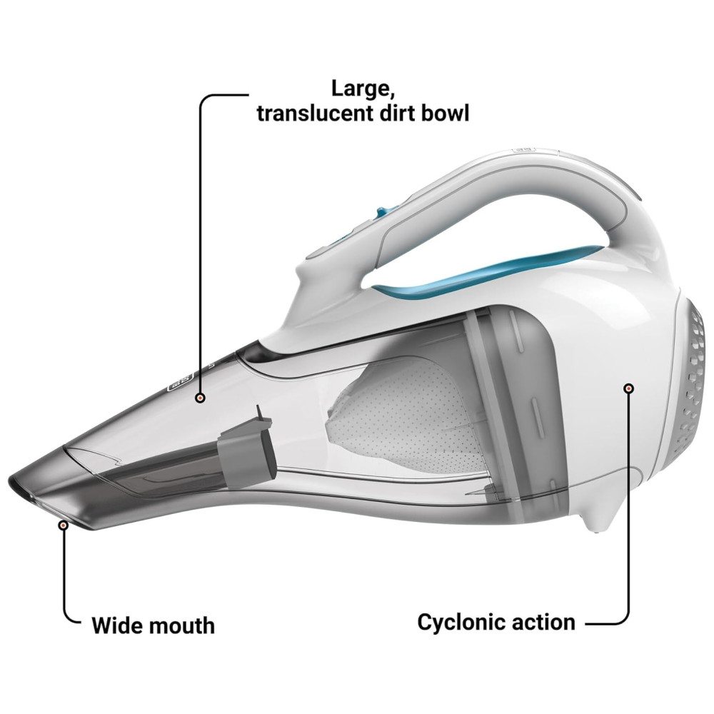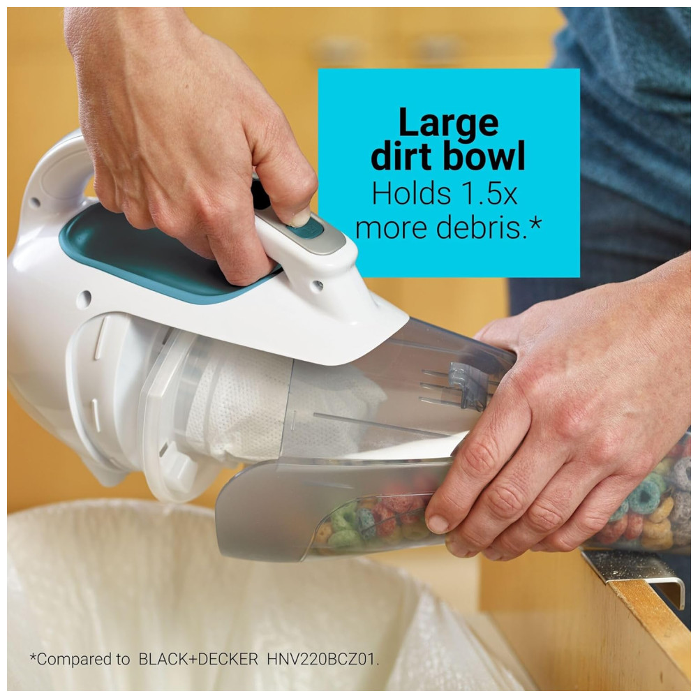 O aspirador portátil sem fio BLACKDECKER dustbuster é a ferramenta perfeita para quem busca equilíbrio entre portabilidade e capacidade de limpeza. Com sua maior capacidade de tigela, é possível limpar toda a casa sem precisar esvaziá-la com frequência. Além disso, é leve e portátil, com uma ferramenta para fendas e uma escova pushin, que permitem a limpeza em espaços apertados e áreas de difícil acesso. A boca larga recolhe detritos maiores de forma rápida e fácil, enquanto a ação ciclônica mantém a sucção poderosa e consistente. O aspirador é indicado para uso em múltiplas superfícies, como carpetes, interiores de automóveis, móveis e áreas de tráfego intenso. A tigela de sujeira translúcida e sem saco coleta mais 50% de sujeira em comparação com o modelo HNV220BCZ01 e esvazia facilmente para simples eliminação de detritos. Ainda, a taça e filtro de sujeira são laváveis, podendo ser limpos direto na pia. O aspirador é alimentado por uma bateria de íon de lítio, o que o torna ideal para trabalhos maiores que exigem limpeza rápida. O produto inclui 1 aspirador de mão HHVI315JO42, 1 carregador de tomada, 1 ferramenta para fendas e 1 escova pushin.
