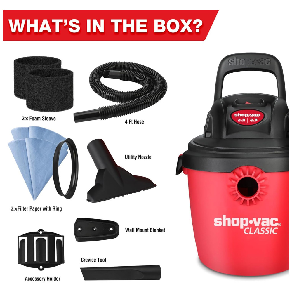 Componentes incluídos: aspirador úmido e seco, luva de espuma, filtro de disco reutilizável com anel, mangueira 1,22 metros, bocal gulper, ferramenta para fendas, suporte de montagem na parede para aspirador, porta ferramentas.