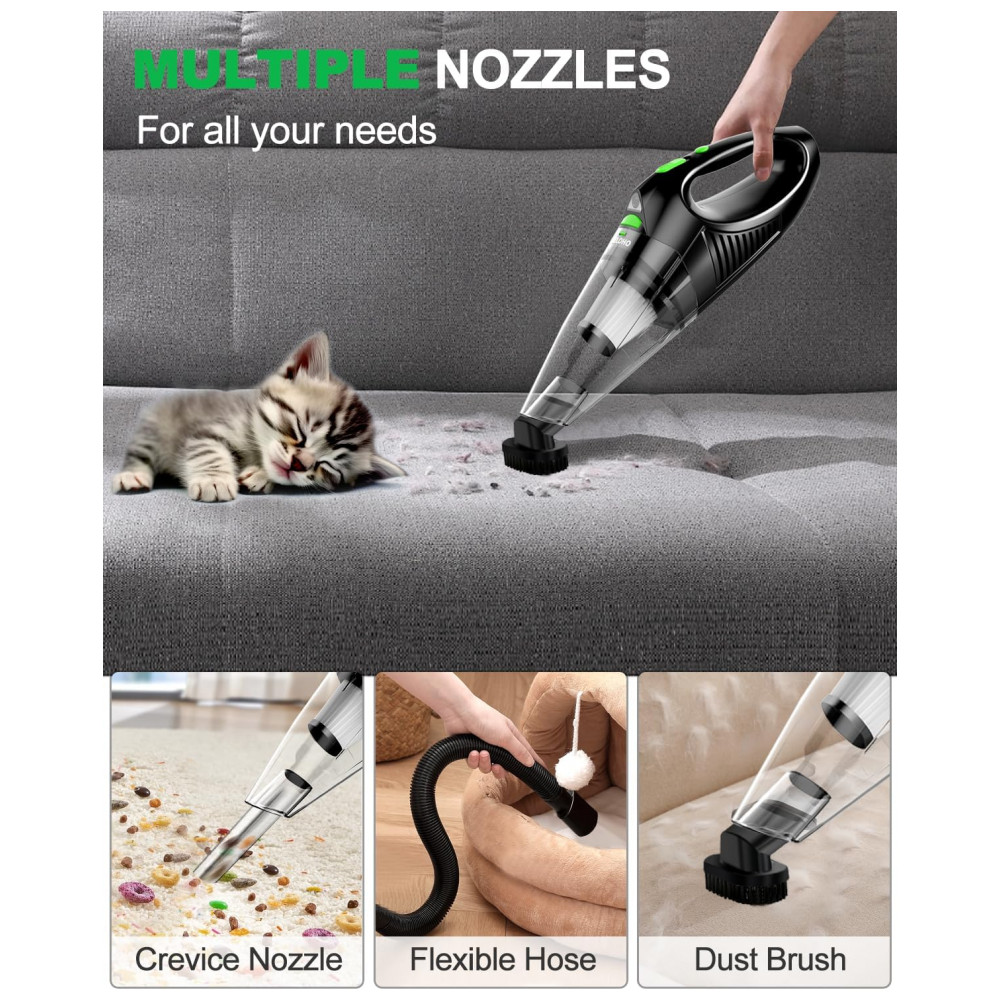 ATAQUES DE LIMPEZA MÚLTIPLAS Este aspirador de mão sem fio possui 4 acessórios, que podem ajudá lo a limpar facilmente escadas, cozinha, carro ou cantos de difícil acesso. o bico da escova limpa os cabelos dos tapetes, bico de fenda , mangueira flexível pode limpar fendas e cantos. Anexos: mangueira flexível x1, bico de escova x1, bico de fenda x1, escova pequena x1, filtro x1