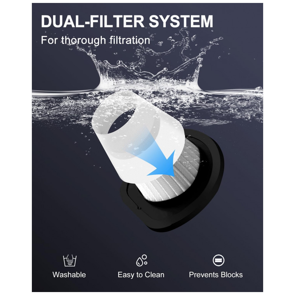 FILTRO HEPA PRO, FILTRAÇÃO DUPLA O filtro profissional HEPA do nosso aspirador de pó possui um filtro grosso e uma camada de filtro fino, feita de material de fibra eletrostática com tecnologia especial. que evitem entupimentos, melhorem o desempenho da filtragem e impeçam a entrada de poeira fina no motor, prolongando a vida útil do motor. Fácil de lavar com água.