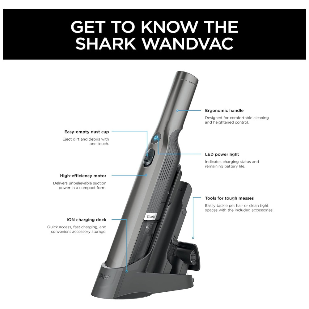 O aspirador de mão sem fio Shark WANDVAC combina portabilidade leve com incrível poder de sucção de um motor sem escova de alta velocidade.