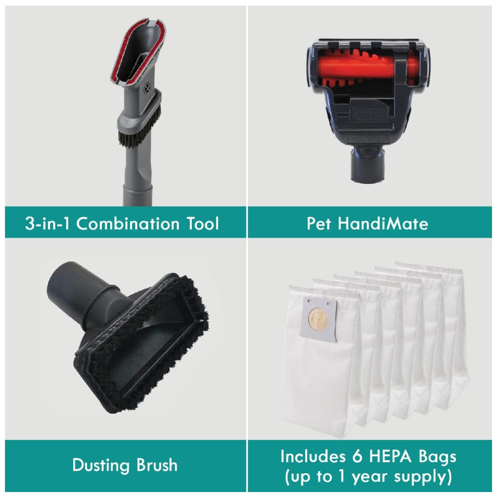 Componentes Incluídos: Escova de Poeira, Ferramenta de Combinação 3 em 1, 6 sacos HEPA, Pet Handi-Mate