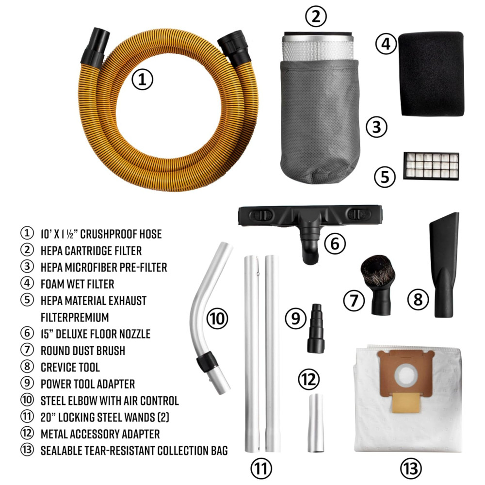 Componentes Incluídos: 2 Extensões de Aço de 50,8 cm, Adaptador para Ferramentas Elétricas, Filtro de Cartucho HEPA, Mangueira Industrial Resistente a Esmagamento de 3 metros x 3,81 centímetros, Filtro de Exaustão de Material HEPA, 1 Cotovelo de Aço com Ajustador de Fluxo de Ar, Manga de Espuma Reutilizável, Saco de Coleta de Poeira Fina de Alta Eficiência, Escova Redonda com Cerdas de Cavalo, Ferramenta para Frestas, Bocal de 38,1 cm para Piso (com 2 escovas), Pré-Filtro de Microfibra
