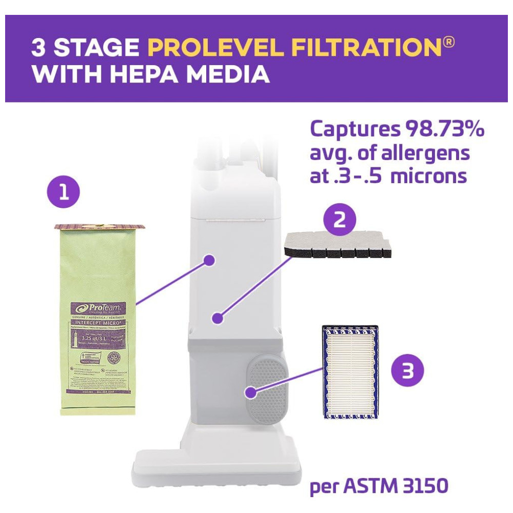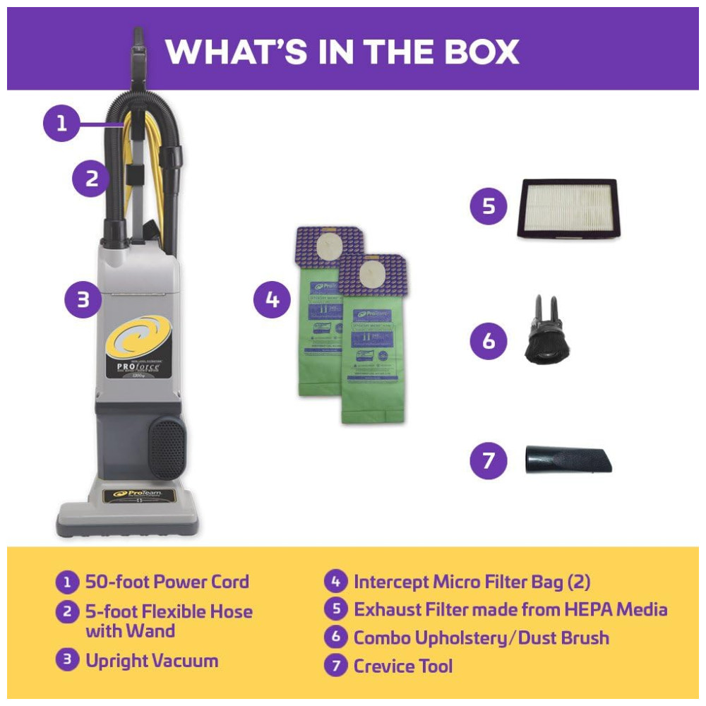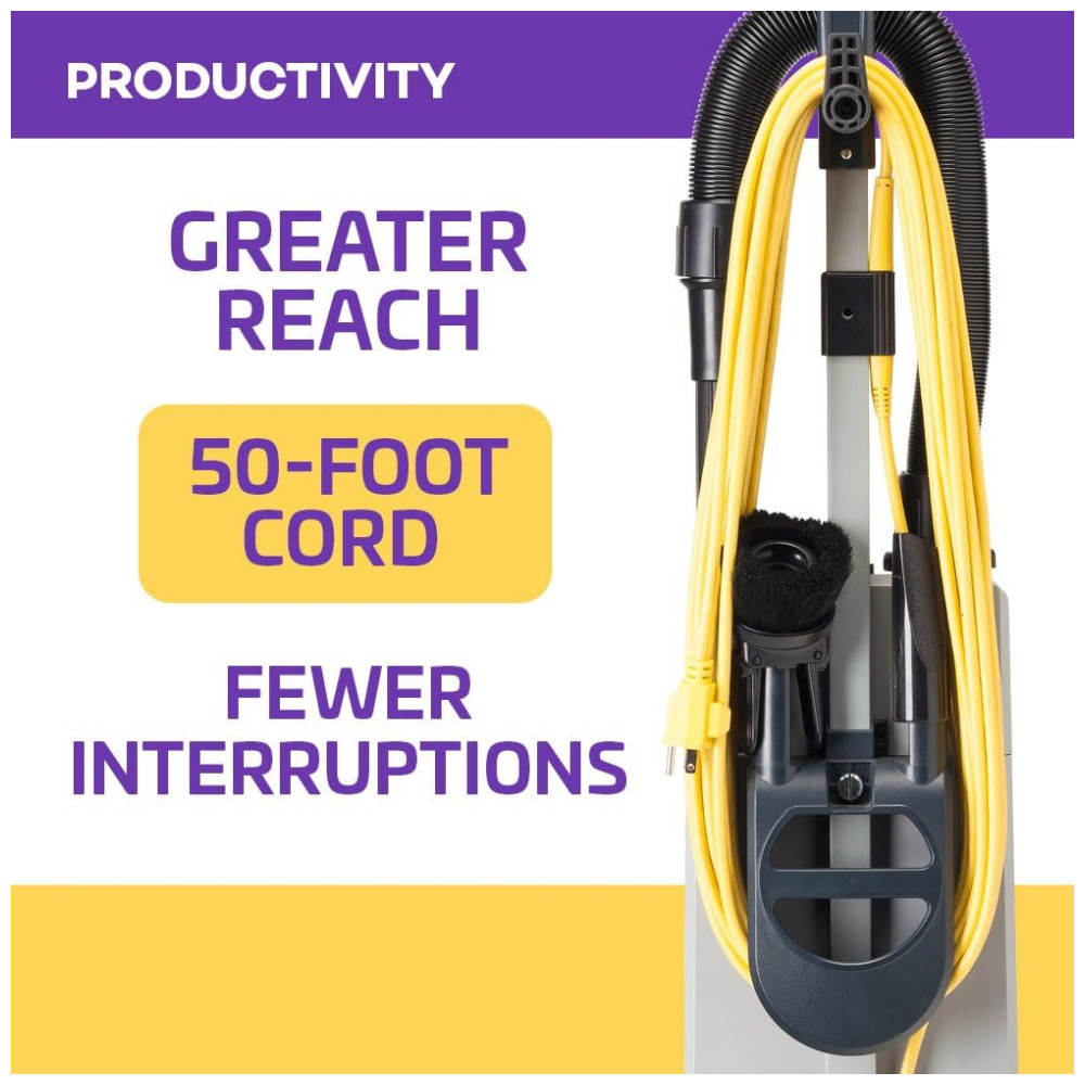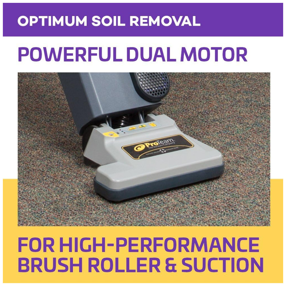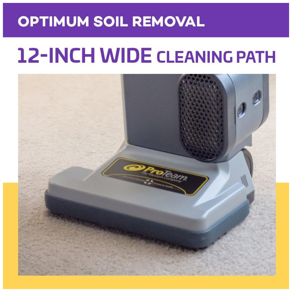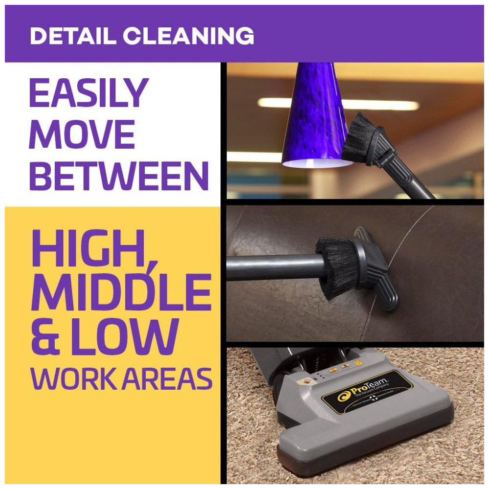 Sua capacidade de limpeza é excepcional, ideal para tapetes de alta pilosidade e pisos de madeira, enquanto a mangueira ultraflexível e a varinha de limpeza alcançam áreas de difícil acesso, como embaixo das camas e cantos. O design versátil deste aspirador comercial da ProTeam inclui uma cabeça de perfil baixo e em forma de L, perfeita para espaços menores e para aspirar sob e ao redor de móveis.