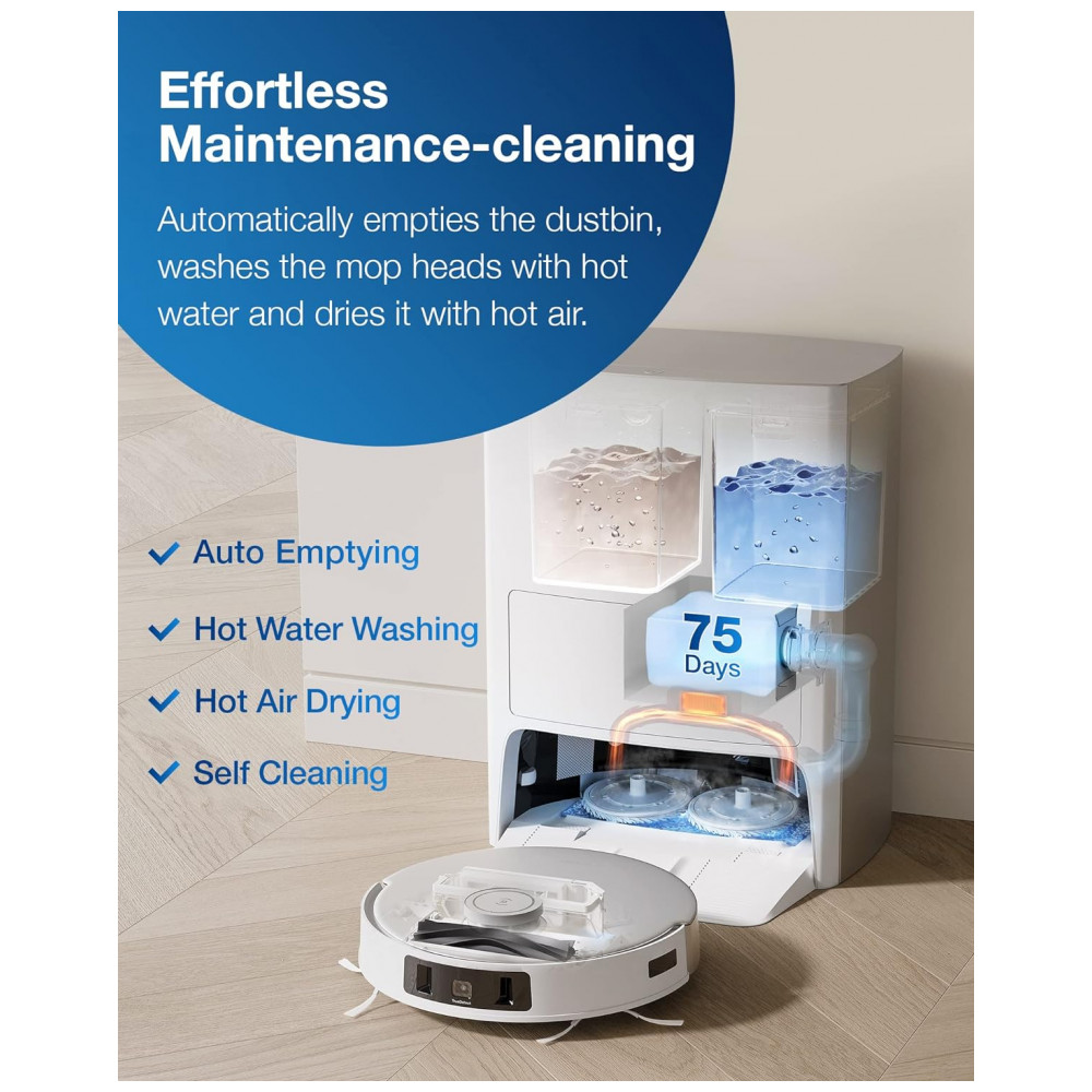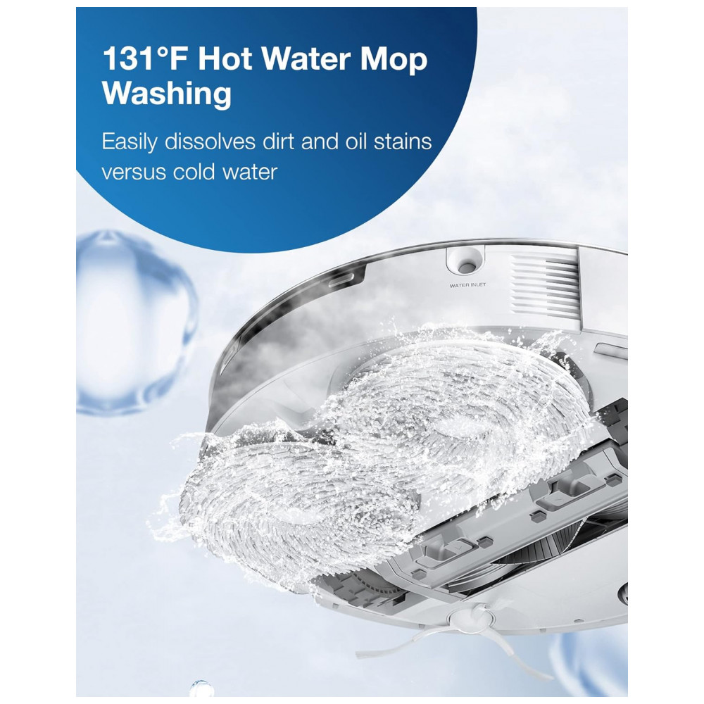 O primeiro robô aspirador e aspirador de pó da indústria com lavagem de esfregão com água quente. O T20 OMNI lava o esfregão com água quente para dissolver óleo e sujeira e seca com ar quente. Trazendo o calor para o jogo de limpeza.
