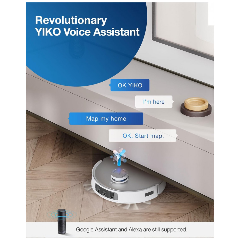 Inteligência de próximo nível com YIKO Voice Assistant. Usar seu T20 OMNI parecerá uma segunda natureza. O sistema de comando de voz torna a limpeza de sua casa tão simples quanto dizer Ok, YIKO, aspire embaixo do sofá da sala de estar. YIKO é um sistema de controle natural que é ainda mais fácil do que apertar um botão.