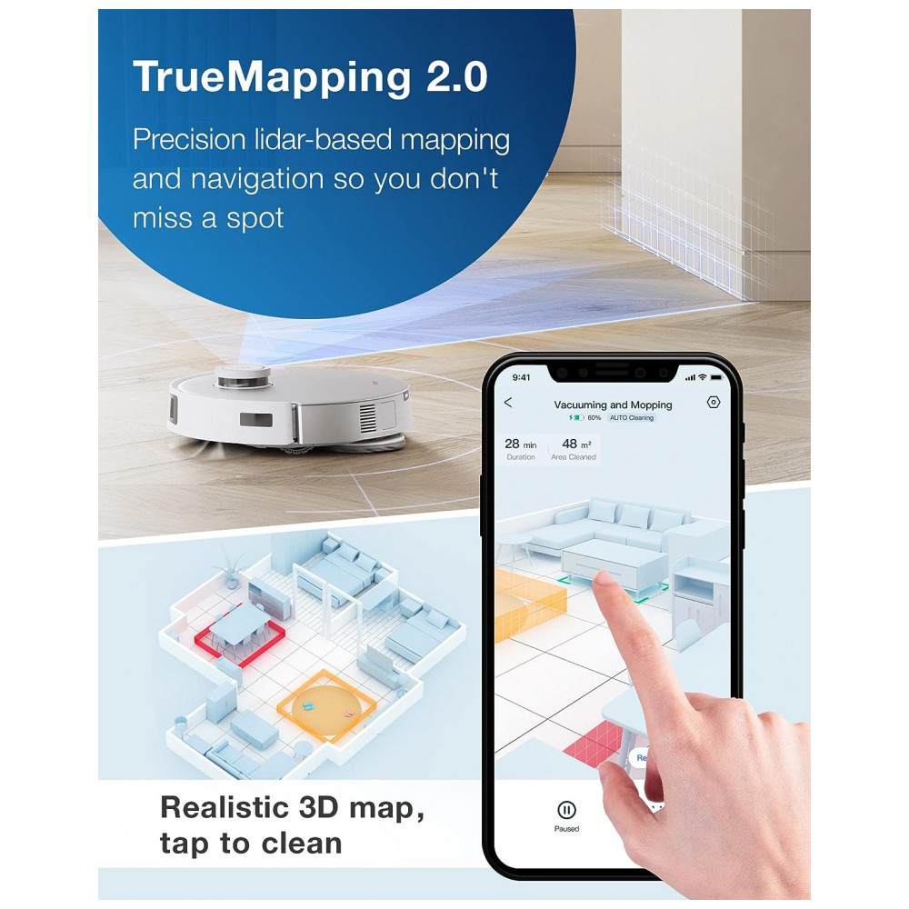 Conhece sua casa melhor do que você. Não importa o quão complicada seja a sua casa, a tecnologia T20 OMNI TrueMapping 2.0 otimizada pode realizar uma varredura de 360 do ambiente doméstico. A precisão de detecção de objetos pequenos é 4 vezes maior do que o LDS, resultando em um mapeamento mais rápido e preciso.