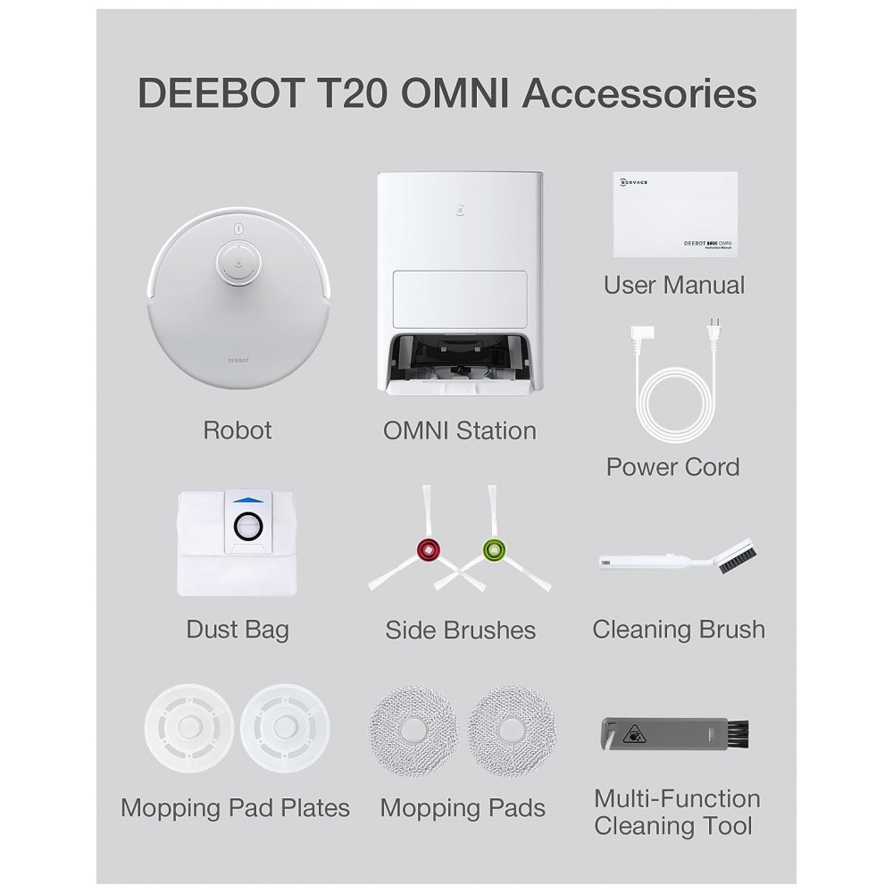 O que você obtém aspirador de pó T20, estação OMNI, 1 conjunto de esfregões, 1 saco de pó com vedação automática, 1 conjunto de escovas laterais, 1 escova de limpeza, ferramenta de limpeza multifuncional, manual do usuário