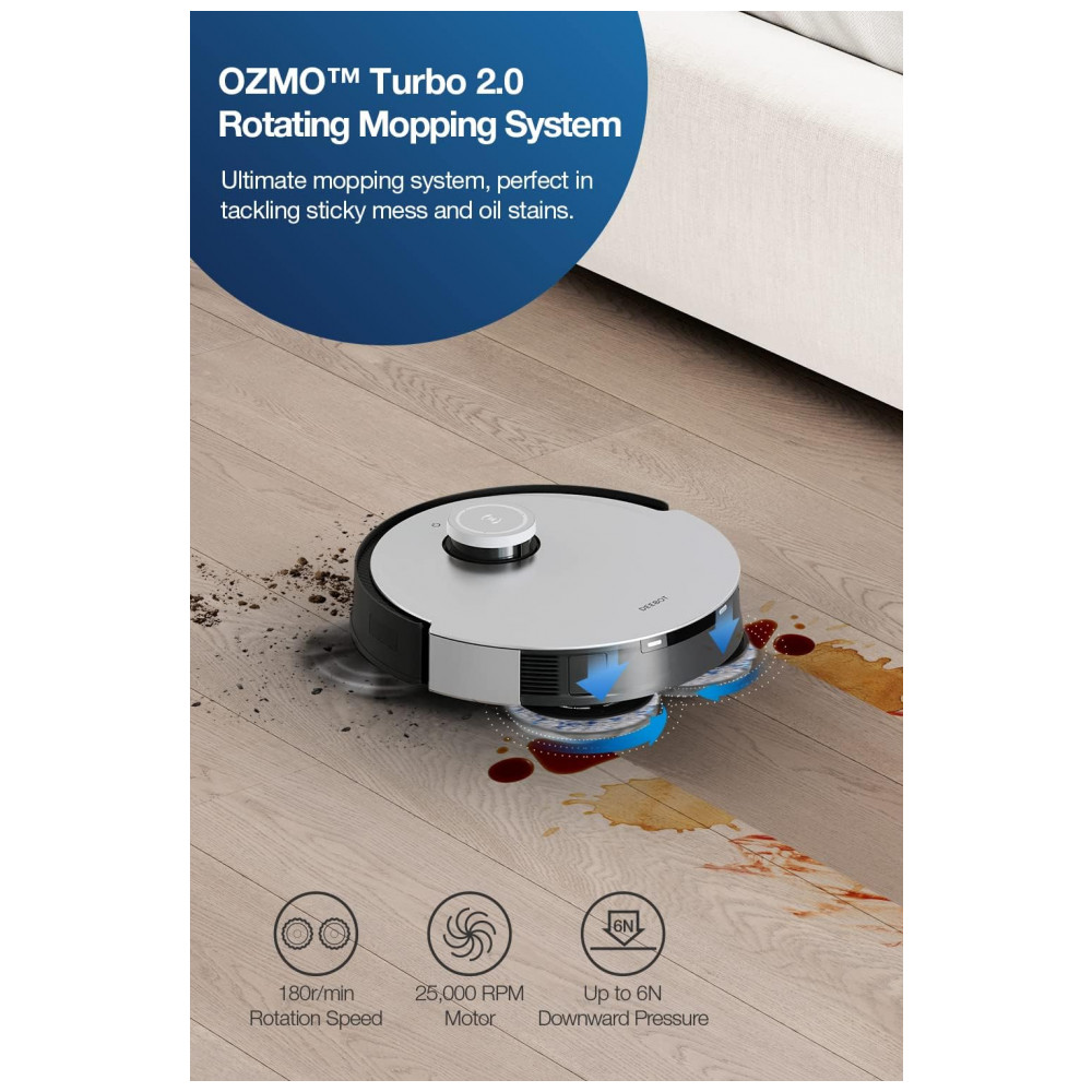 5000PA LIMPEZA PROFUNDA E TOTALMENTE . Com poder de sucção superior de 5.000 PA, seu DEEBOT coleta detritos com mais eficiência de pisos duros e carpetes. O sistema de esfregona rotativa OZMO Turbo funciona duplamente na remoção de manchas e detritos difíceis, deixando o chão limpo como .