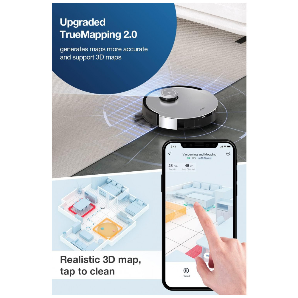 MÁXIMA COBERTURA, MENOS PONTOS PERDIDO. Com TrueMapping, o mais avançado sistema de navegação baseado em laser, seu DEEBOT escaneia o ambiente doméstico para criar os caminhos de limpeza mais eficientes e rápidos. Mapeamento e navegação de precisão inigualável resultam em cobertura metódica com menos pontos perdidos.
