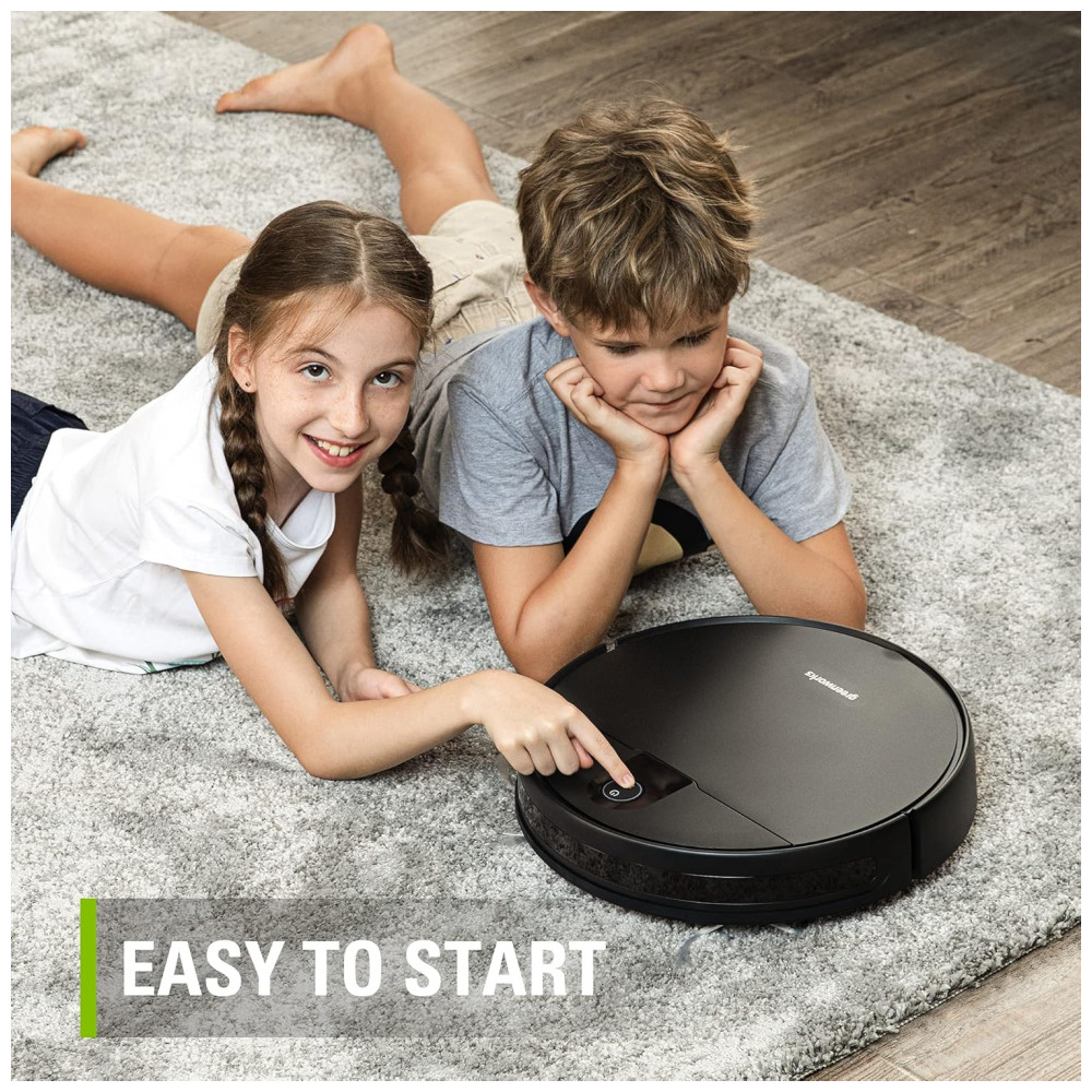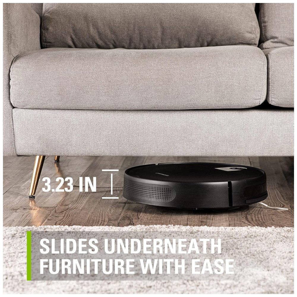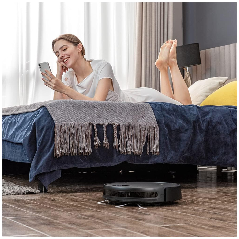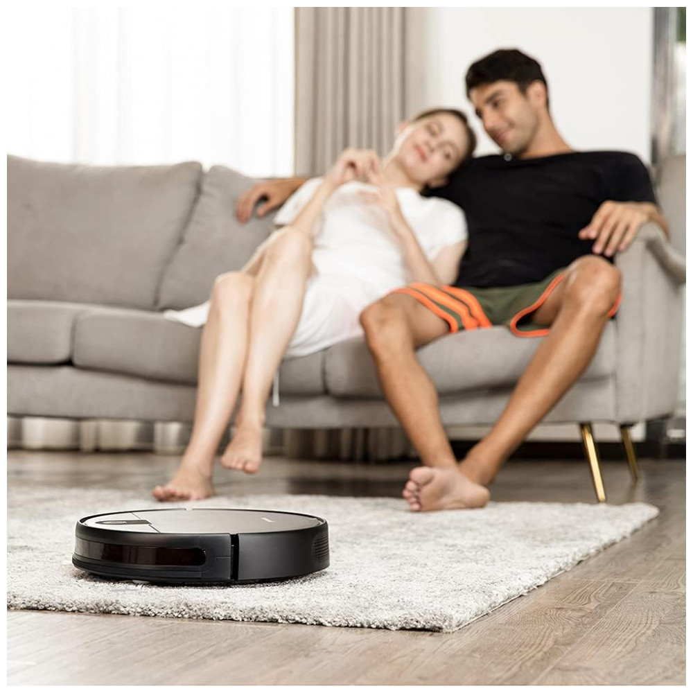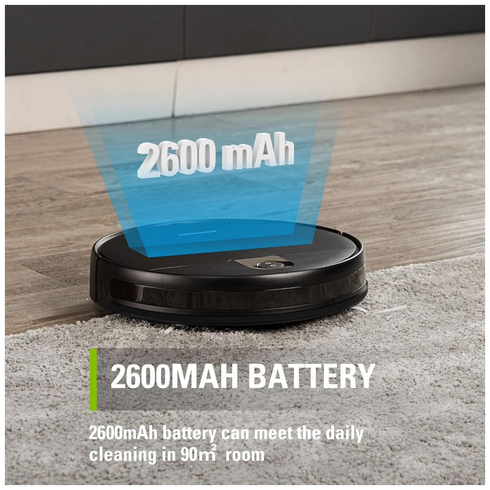 Limpe tudo com o poder de sucção de 2200Pa Este aspirador de pó robótico é poderoso o suficiente para limpar sujeira e cabelos de pisos, carpetes e muito mais. As duas escovas laterais e a escova giratória intermediária fornecem amplo poder de sucção para uma limpeza silenciosa e eficiente. Perfeito para casas com animais de estimação.