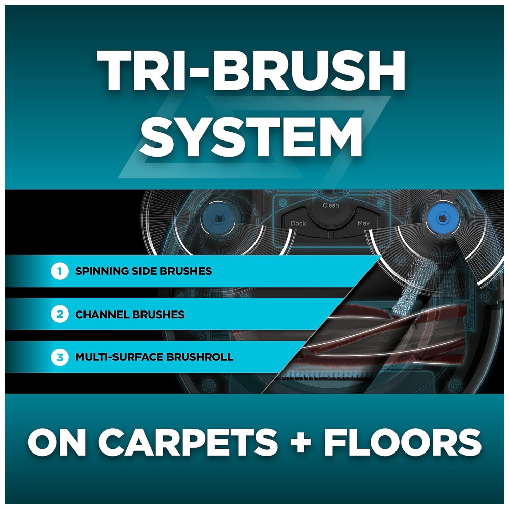 TRÊS TIPOS DE ESCOVA. UMA LIMPEZA PODEROSA O sistema Tri Brush combina escovas laterais, escovas de canal e uma escova multi superfície para lidar com os detritos em todas as superfícies.