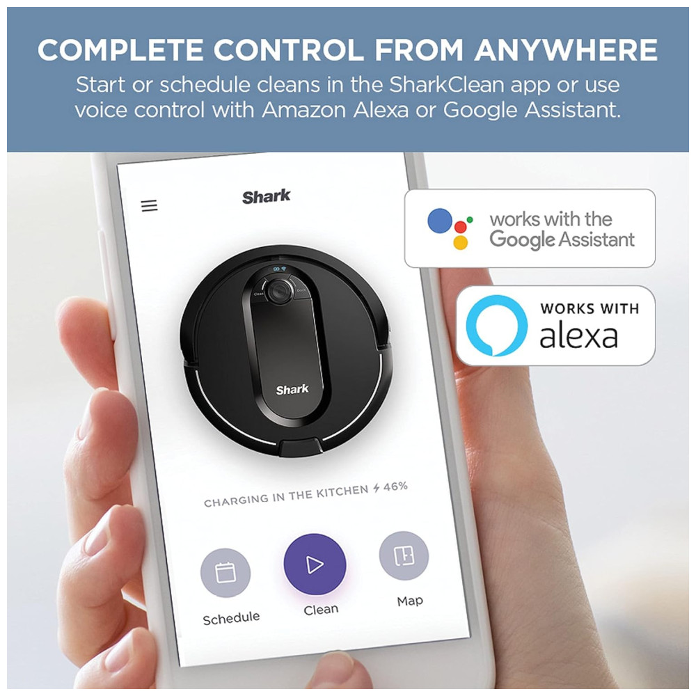 COMANDO DE TELEFONE OU VOZ Programe a limpeza de toda a casa ou direcione quartos ou áreas específicas para limpar agora mesmo com o aplicativo SharkClean ou controle de voz com AMZ Alexa ou Google Assistant.