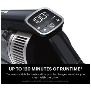 Autonomia Estendida: Com duas baterias removíveis, este aspirador oferece até 120 minutos de limpeza contínua no modo ECO. Mais tempo de limpeza, menos interrupções.